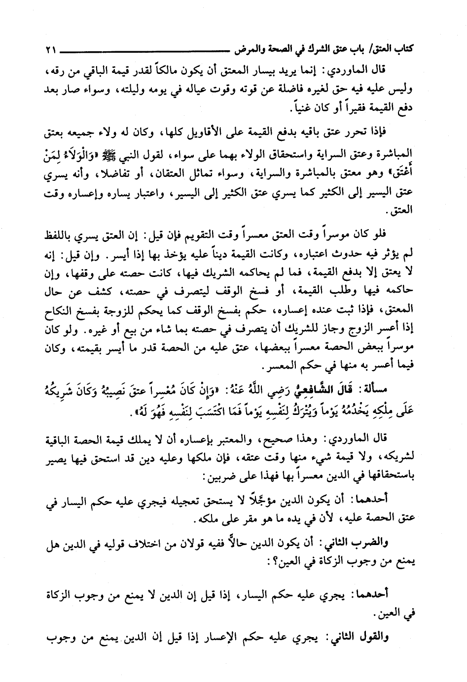 قَالَ الْمَاوَرْدِيُّ: وَهَذَا صَحِيحٌ، وَالْمُعْتَبَرُ بِإِعْسَارِهِ أَن لَا يَمْلِكَ قِيمَةَ الْحِصَّةِ الْبَاقِيَةِ لِشَرِيكِهِ، وَلَا قِيمَةَ شَيْءٍ مِنْهَا وَقْتَ عِتْقِهِ، فَإِنْ مَلَكَهَا وَعَلَيْهِ دَيْنٌ قَدِ اسْتُحِقَّ فِيهَا يَصِيرُ بِاسْتِحْقَاقِهَا فِي الدَّيْنِ مُعْسِرًا بِهَا فَهَذَا عَلَى ضَرْبَيْنِ: