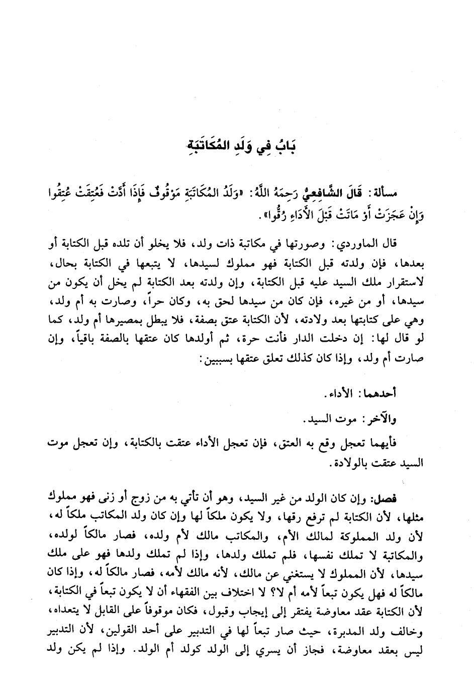 قَالَ الْمَاوَرْدِيُّ: وَصُورَتُهَا فِي مُكَاتَبَةٍ ذَاتِ وَلَدٍ، فَلَا يَخْلُو أَنْ تَلِدَهُ قَبْلَ الْكِتَابَةِ أَوْ بَعْدَهَا، فَإِنْ وَلَدَتْهُ قَبْلَ الْكِتَابَةِ فَهُوَ مَمْلُوكٌ لِسَيِّدِهَا، لَا يَتْبَعُهَا فِي الْكِتَابَةِ بِحَالٍ، لِاسْتِقْرَارِ مِلْكِ السَّيِّدِ عَلَيْهِ قَبْلَ الْكِتَابَةِ، وَإِنْ وَلَدَتْهُ بَعْدَ الْكِتَابَةِ لَمْ يَخْلُ أَنْ يَكُونَ مِنْ سَيِّدِهَا، أَوْ مِنْ غَيْرِهِ، فَإِنْ كَانَ مِنْ سَيِّدِهَا لَحِقَ بِهِ، وَكَانَ حُرًّا، وَصَارَتْ بِهِ أُمَّ وَلَدٍ، وَهِيَ عَلَى كِتَابَتِهَا بَعْدَ وِلَادَتِهِ، لِأَنَّ الْكِتَابَةَ عِتْقٌ بِصِفَةٍ، فَلَا يَبْطُلُ بِمَصِيرِهَا أُمَّ وَلَدٍ، كَمَا لَوْ قَالَ لَهَا: إِنْ دَخَلْتِ الدَّارَ فَأَنْتِ حُرَّةٌ، ثُمَّ أولدها وكان عِتْقُهَا بِالصِّفَةِ بَاقِيًا، وَإِنْ صَارَتْ أُمَّ وَلَدٍ، وَإِذَا كَانَ كَذَلِكَ تَعَلَّقَ عِتْقُهَا بِسَبَبَيْنِ: