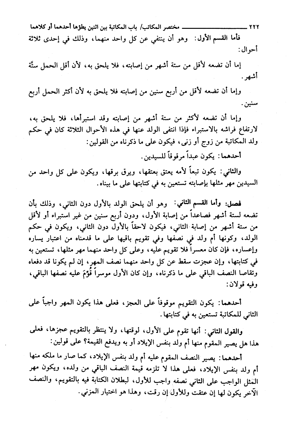 وَأَمَّا الْقِسْمُ الثَّانِي: وَهُوَ أَنْ يُلْحَقَ الْوَلَدُ بِالْأَوَّلِ دُونَ الثَّانِي، وَذَلِكَ بِأَنْ تَضَعَهُ لِسِتَّةِ أَشْهُرٍ فَصَاعِدًا مِنْ إِصَابَةِ الْأَوَّلِ، وَدُونَ أَرْبَعِ سِنِينَ مِنْ غَيْرِ اسْتِبْرَاءٍ أَوْ لِأَقَلَّ مِنْ سِتَّةِ أَشْهُرٍ مِنْ إِصَابَةِ الثَّانِي، فَيَكُونُ لَاحِقًا بِالْأَوَّلِ دُونَ الثَّانِي، وَيَكُونُ فِي حُكْمِ الْوَلَدِ، وَكَوْنِهَا أُمَّ وَلَدٍ فَيَ نِصْفِهَا وَفِي تَقْوِيمِ بَاقِيهَا عَلَى مَا قَدَّمْنَاهُ مِنَ اعْتِبَارِ يَسَارِهِ وَإِعْسَارِهِ، فَإِنْ كَانَ مُعْسِرًا فَلَا تَقْوِيمَ عَلَيْهِ، وَعَلَى كُلِّ وَاحِدٍ مِنْهُمَا مَهْرُ مِثْلِهَا، تَسْتَعِينُ بِهِ فِي كِتَابَتِهَا، وَإِنْ عَجَزَتْ سَقَطَ عَنْ كُلِّ وَاحِدٍ مِنْهُمَا نِصْفُ الْمَهْرِ، إِنْ لَمْ يَكُونَا قَدْ دَفَعَاهُ وَتَقَاصَّا النِّصْفَ الْبَاقِي عَلَى مَا ذَكَرْنَاهُ، وَإِنْ كَانَ الْأَوَّلُ مُوسِرًا قُوِّمَ عَلَيْهِ نِصْفُهَا الْبَاقِي، وَفِيهِ قَوْلَانِ: