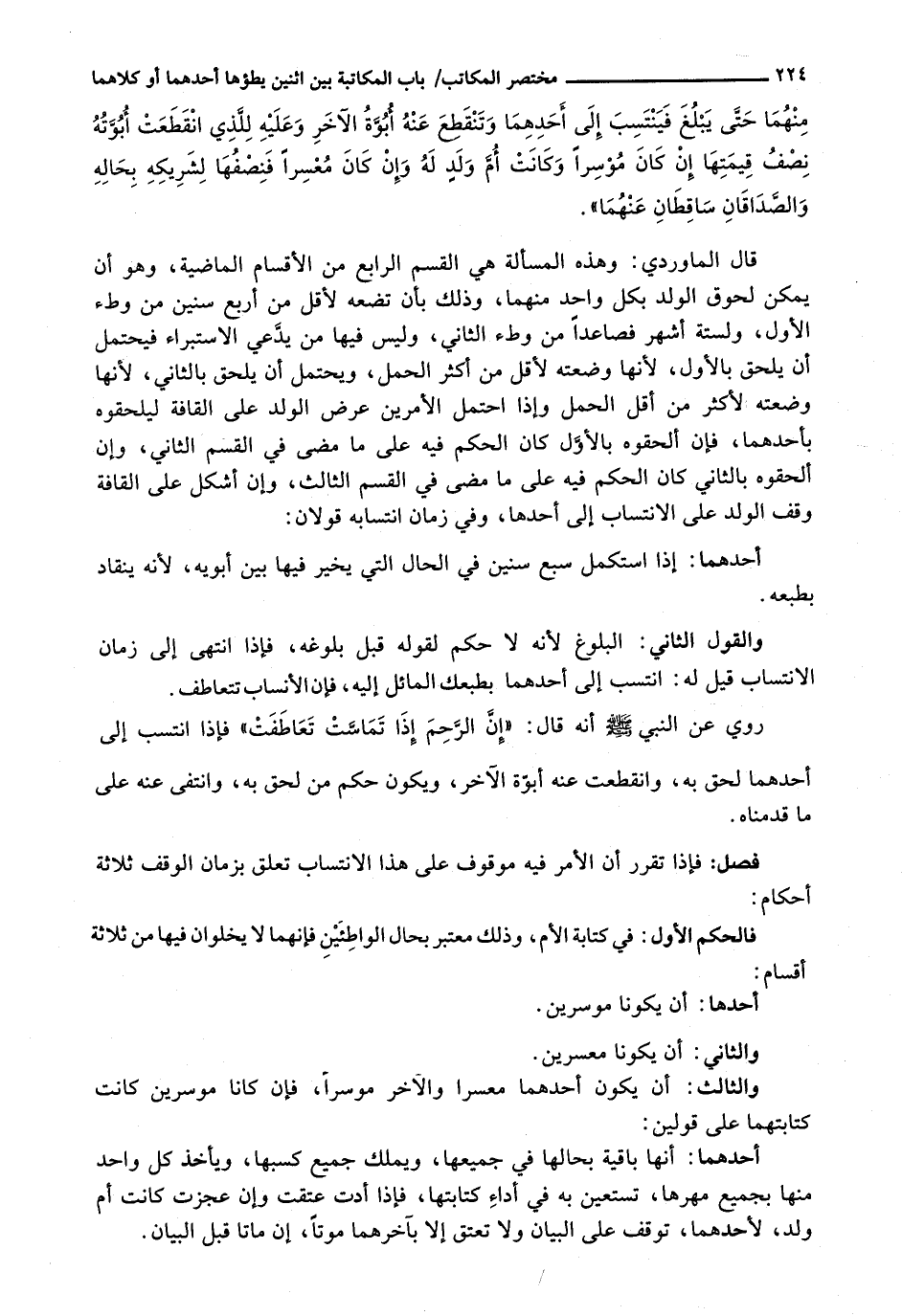رُوِيَ عَنِ النَّبِيِّ - صَلَّى اللَّهُ عَلَيْهِ وَسَلَّم َ - أَنَّهُ قَالَ: " إِنَّ الرَّحِمَ إِذَا تَمَاسَّتْ تَعَاطَفَتْ " فَإِذَا انْتَسَبَ إِلَى أَحَدِهِمَا لَحِقَ بِهِ، وَانْقَطَعَتْ عَنْهُ أُبُوَّةُ الْآخَرِ، وَيَكُونُ حُكْمُ مَنْ لَحِقَ بِهِ، وَانْتَفَى عَنْهُ عَلَى مَا قَدَّمْنَاهُ.
