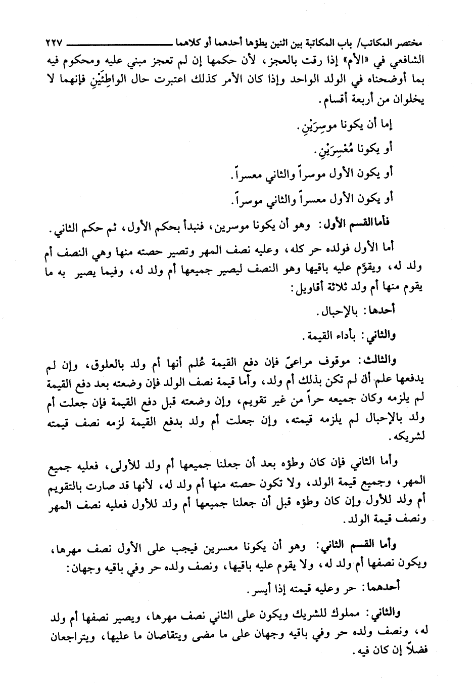 الشَّافِعِيُّ فِي (الْأُمِّ) إِذَا رَقَّتْ بِالْعَجْزِ، لِأَنَّ حُكْمَهَا إِنْ لَمْ تَعْجِزْ مَبْنِيٌّ عَلَيْهِ وَمَحْكُومٌ فِيهِ بِمَا أَوْضَحْنَاهُ فِي الْوَلَدِ الْوَاحِدِ وَإِذَا كَانَ الْأَمْرُ كَذَلِكَ اعْتُبِرَتْ حَالُ الْوَاطِئَيْنِ فَإِنَّهُمَا لَا يَخْلُوَانِ مِنْ أَرْبَعَةِ أَقْسَامٍ.