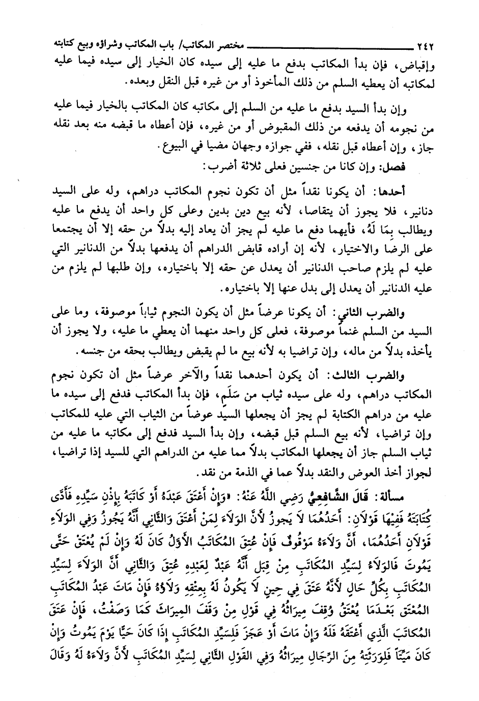 وَإِقْبَاضٍ، فَإِنْ بَدَأَ الْمُكَاتَبُ بِدَفْعِ مَا عَلَيْهِ إِلَى سَيِّدِهِ كَانَ الْخِيَارُ إِلَى سَيِّدِهِ فِيمَا عَلَيْهِ لِمُكَاتَبِهِ أَنْ يُعْطِيَهُ السَّلَمَ مِنْ ذَلِكَ الْمَأْخُوذِ أَوْ مِنْ غَيْرِهِ قَبْلَ النَّقْلِ وَبَعْدِهِ.