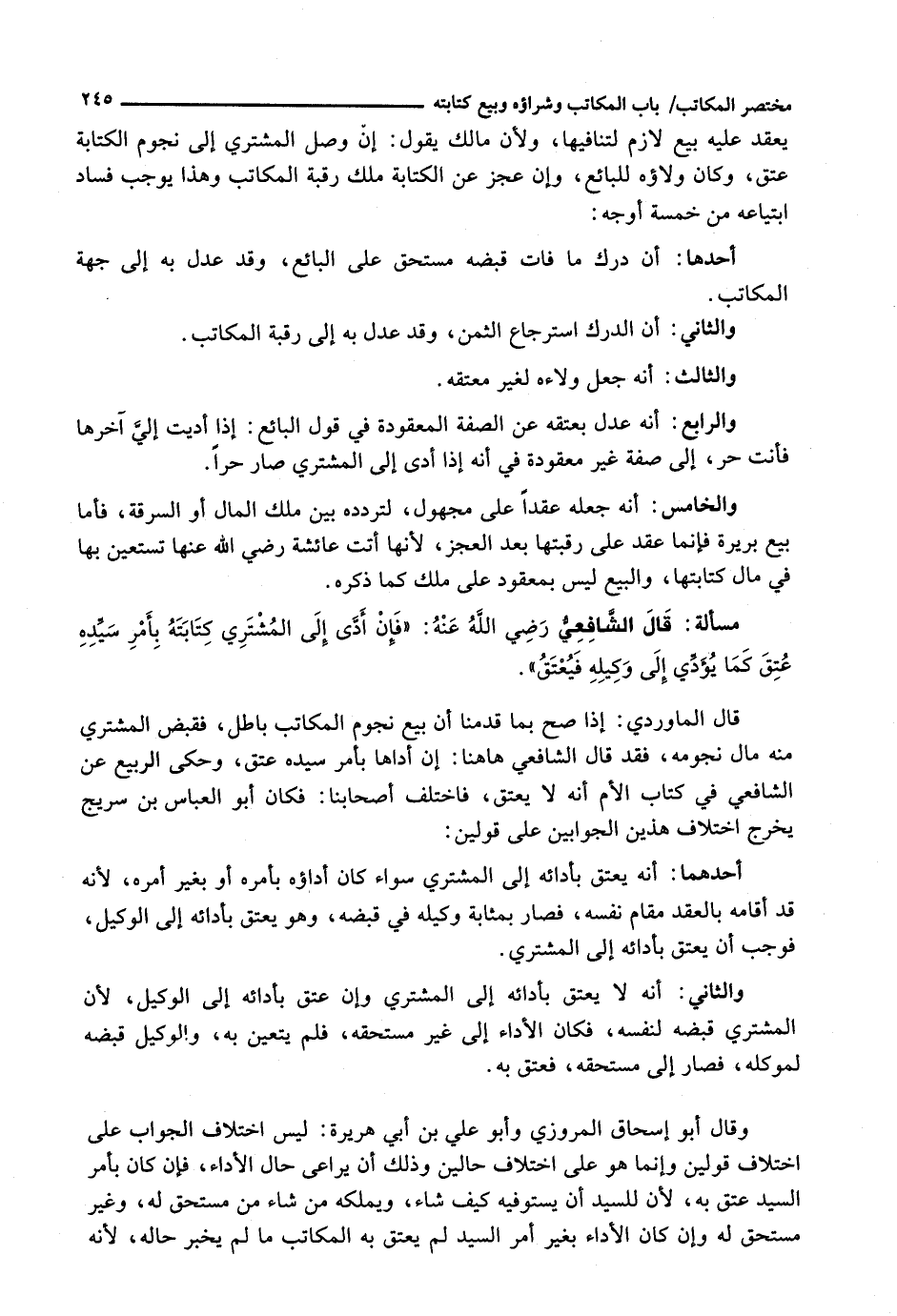 يعقد عليه بيع لازم لتنافيها، ولأن مالك يَقُولُ: إِنْ وَصَلَ الْمُشْتَرِي إِلَى نُجُومِ الْكِتَابَةِ عَتَقَ، وَكَانَ وَلَاؤُهُ لِلْبَائِعِ، وَإِنْ عَجَزَ عَنِ الْكِتَابَةِ مَلَكَ رَقَبَةَ الْمُكَاتَبِ وَهَذَا يُوجِبُ فَسَادَ ابْتِيَاعِهِ مِنْ خَمْسَةِ أَوْجُهٍ: