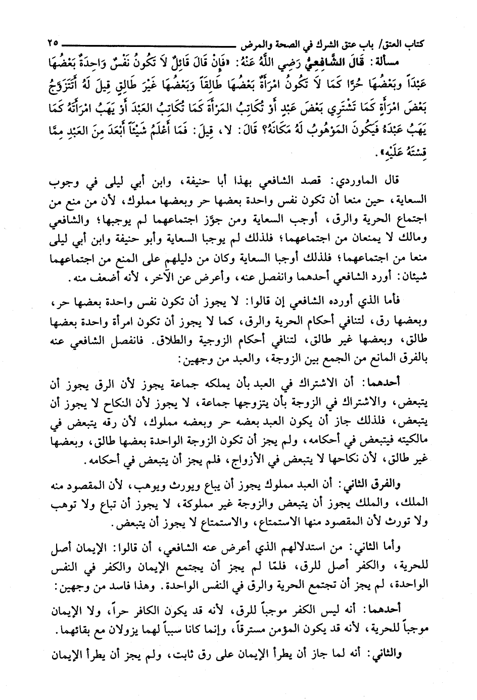 : قال الشافعي رضي الله عنه: (فَإِنْ قَالَ قَائِلٌ لَا تَكُونُ نَفْسٌ وَاحِدَةٌ بَعْضُهَا عَبْدًا وَبَعْضُهَا حُرًّا كَمَا لَا تَكُونُ امْرَأَةٌ بَعْضُهَا طَالِقًا وَبَعْضُهَا غَيْرَ طَالِقٍ قِيلَ لَهُ أَتَتَزَوَّجُ بَعْضَ امْرَأَةٍ كَمَا تَشْتَرِي بَعْضَ عَبْدٍ أَوْ تُكَاتِبُ الْمَرْأَةَ كَمَا تُكَاتِبَ الْعَبْدَ أَوْ يَهَبُ امْرَأَتَهُ كَمَا يَهَبُ عَبْدَهُ فَيَكُونُ الْمَوْهُوبُ لَهُ مَكَانَهُ؟ قَالَ: لَا، قِيلَ: فَمَا أَعْلَمُ شَيْئًا أَبْعَدَ مِنَ الْعَبْدِ مِمَّا قِسْتَهُ عَلَيْهِ) .