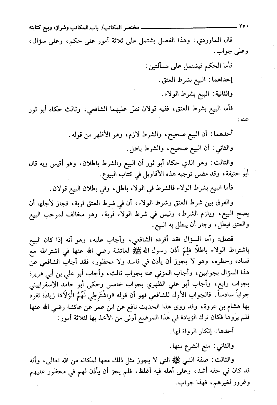 وَأَمَّا السُّؤَالُ فَقَدْ أَفْرَدَهُ الشَّافِعِيُّ، وَأَجَابَ عَلَيْهِ، وَهُوَ أَنَّهُ إِذَا كَانَ الْبَيْعُ بِاشْتِرَاطِ الْوَلَاءِ بَاطِلًا فَلِمَ أَذِنَ رَسُولُ اللَّهِ - صَلَّى اللَّهُ عَلَيْهِ وَسَلَّم َ - لِعَائِشَةَ رَضِيَ اللَّهُ عَنْهَا فِي اشْتِرَاطِهِ مَعَ فَسَادِهِ وَحَظْرِهِ، وَهُوَ لَا يَجُوزُ أَنْ يَأْذَنَ فِي فَاسِدٍ وَلَا مَحْظُورٍ، فَقَدْ أَجَابَ الشَّافِعِيُّ عَنْ هَذَا السُّؤَالِ بِجَوَابَيْنِ، وَأَجَابَ الْمُزَنِيُّ عَنْهُ بِجَوَابٍ ثَالِثٍ، وَأَجَابَ أَبُو عَلِيِّ بْنُ أَبِي هُرَيْرَةَ بِجَوَابٍ رَابِعٍ، وَأَجَابَ أَبُو عَلِيٍّ الظَّهْرِيُّ بِجَوَابٍ خَامِسٍ وَحَكَى أَبُو حَامِدٍ الْإِسْفَرَايِينِيُّ جَوَابًا سَادِسًا. فَالْجَوَابُ الْأَوَّلُ لِلشَّافِعِيِّ فَهُوَ أَنَّ قَوْلَهُ (وَاشْتَرِطِي لَهُمُ الْوَلَاءَ) زِيَادَةٌ تَفَرَّدَ بِهَا هِشَامُ بْنُ عُرْوَةَ، وَقَدْ رَوَى هَذَا الْحَدِيثَ نَافِعٌ عَنِ ابْنِ عُمَرَ عَنْ عَائِشَةَ رَضِيَ اللَّهُ عَنْهَا فَلَمْ يَرْوِهَا فَكَانَ تَرْكُ الزِّيَادَةِ فِي هَذَا الْمَوْضِعِ أَوْلَى مِنَ الْأَخْذِ بِهَا لِثَلَاثَةِ أُمُورٍ: