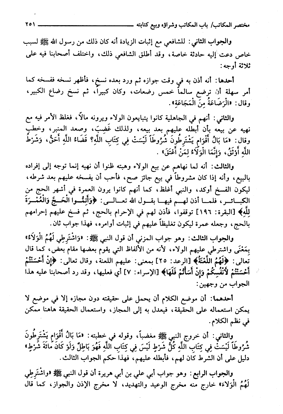 وَالثَّانِي: أَنَّ خُرُوجَ النَّبِيِّ - صَلَّى اللَّهُ عَلَيْهِ وَسَلَّم َ - مُغْضَبًا، وَقَوْلَهُ فِي خُطْبَتِهِ: (مَا بَالُ أَقْوَامٍ يَشْتَرِطُونَ شُرُوطًا لَيْسَتْ فِي كِتَابِ اللَّهِ كُلُّ شَرْطٍ لَيْسَ فِي كِتَابِ اللَّهِ فَهُوَ بَاطِلٌ وَلَوْ كَانَ مِائَةَ شَرْطٍ) دَلِيلٌ عَلَى أَنَّ الشَّرْطَ كَانَ لَهُمْ، فَأَبْطَلَهُ عَلَيْهِمْ، فَهَذَا حُكْمُ الْجَوَابِ الثَّالِثِ.