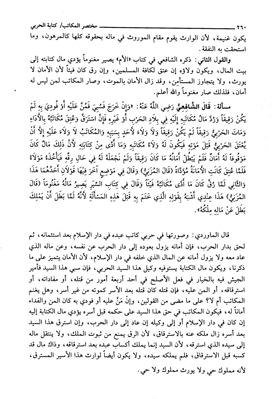 قَالَ الْمَاوَرْدِيُّ: وَصُورَتُهَا فِي حَرْبِيٍّ كَاتَبَ عَبْدَهُ فِي دَارِ الْإِسْلَامِ بَعْدَ اسْتِئْمَانِهِ، ثُمَّ لَحِقَ بِدَارِ الْحَرْبِ، فَإِنَّ أَمَانَهُ يَزُولُ بِعَوْدِهِ إِلَى دَارِ الْحَرْبِ عَنْ نَفْسِهِ، وَعَنْ مَالِهِ الَّذِي عَادَ مَعَهُ وَلَا يَزُولُ أَمَانُهُ عَنِ الْمَالِ الَّذِي خَلَّفَهُ فِي دَارِ الْإِسْلَامِ، لِأَنَّ الْأَمَانَ يَتَمَيَّزُ عَلَى مَا ذَكَرْنَا، وَيَكُونُ مَالُ الْكِتَابَةِ يَسْتَوْفِيهِ وَكِيلُ هَذَا السَّيِّدِ الْحَرْبِيِّ، فَإِنْ سُبِيَ هَذَا السَّيِّدُ فَأَمِيرُ الْجَيْشِ فِيهِ بِالْخِيَارِ فِي فِعْلِ الْأَصْلَحِ فِي أَحَدِ أَرْبَعَةِ أُمُورٍ مِنْ قَتْلِهِ، أَوْ مُفَادَاتِهِ، أَوِ اسْتِرْقَاقِهِ، أَوِ الْمَنِّ عَلَيْهِ، فَإِنْ قَتَلَهُ كَانَ قَتْلُهُ بَعْدَ الْأَسْرِ كَمَوْتِهِ مِنْ غَيْرِ أَسْرٍ، وَهَلْ يُغْنَمُ الْمُكَاتَبُ أَمْ لَا؟ عَلَى مَا مَضَى مِنَ الْقَوْلَيْنِ، وَإِنْ مَنَّ عَلَيْهِ أَوْ فُودِيَ بِهِ كَانَ الْمَنُّ وَالْفِدَاءُ أَمَانًا لَهُ، فَيَكُونُ الْمُكَاتَبُ فِي حَقِّ هَذَا السَّيِّدِ عَلَى حُكْمِهِ قَبْلَ أَسْرِهِ يُؤَدِّي مَالَ الْكِتَابَةِ إِلَيْهِ إِنْ كَانَ فِي دَارِ الْإِسْلَامِ أَوْ إِلَى وَكِيلِهِ إِنْ عَادَ إِلَى دَارِ الْحَرْبِ، وَإِنِ اسْتُرِقَّ هَذَا السَّيِّدُ بَعْدَ أَسْرِهِ زَالَ مِلْكُهُ عَنْهُ بِالِاسْتِرْقَاقِ، لِأَنَّ الرِّقَّ يَمْنَعُ مِنْ ثُبُوتِ الْمِلْكِ، وَلَا يَنْتَقِلُ مَالُهُ إِلَى سَيِّدِهِ الَّذِي اسْتَرَقَّهُ، لِأَنَّ السَّيِّدَ إِنَّمَا يَمْلِكُ أَكْسَابَ عَبْدِهِ بَعْدَ اسْتِرْقَاقِهِ، وَذَاكَ مَالٌ قَدْ كَسَبَهُ قَبْلَ الِاسْتِرْقَاقِ، فَلَمْ يَمْلِكْهُ سَيِّدُهُ، وَلَا يَكُونُ أَيْضًا لِوَارِثِ هَذَا الأٍسير الْمُسْتَرَقِّ، لِأَنَّهُ مَمْلُوكٌ حَيٌّ وَلَا يُورَثُ مَمْلُوكٌ ولا حي.