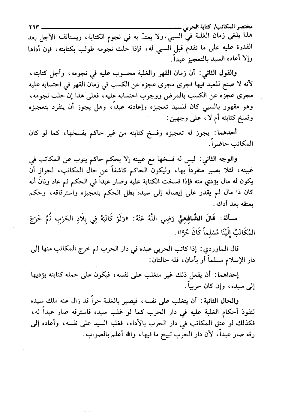 قال الشافعي رضي الله عنه: (وَلَوْ كَاتَبَهُ فِي بِلَادِ الْحَرْبِ ثُمَّ خَرَجَ الْمُكَاتَبُ إِلَيْنَا مُسْلِمًا كَانَ حُرًّا) .