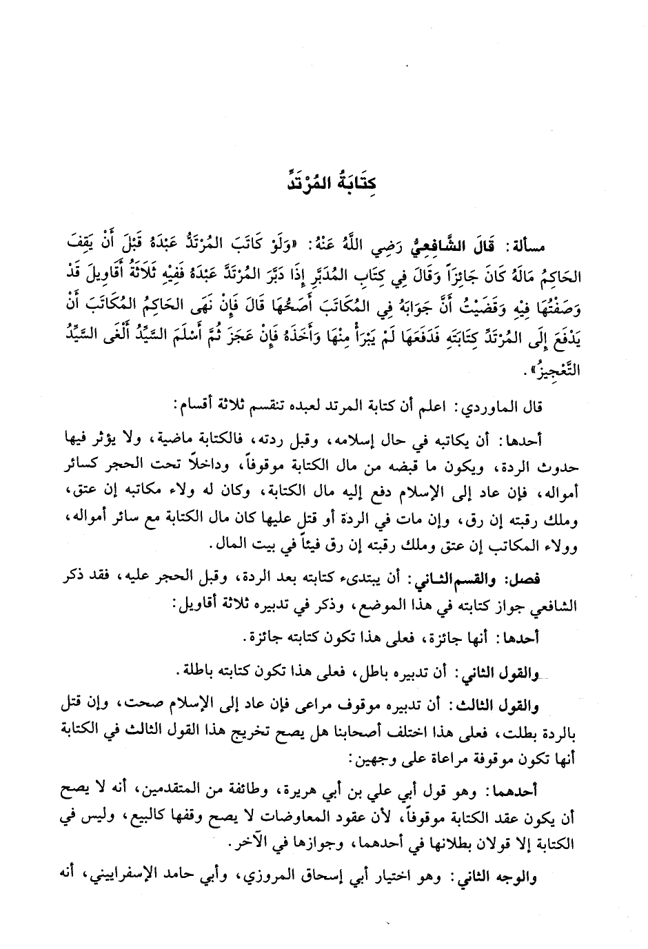 قال الشافعي رضي الله عنه: (وَلَوْ كَاتَبَ الْمُرْتَدُّ عَبْدَهُ قَبْلَ أَنْ يَقِفَ الْحَاكِمُ مَالَهُ كَانَ جَائِزًا وَقَالَ فِي كِتَابِ المدبر إذا دبر المرتد عبده فيه ثَلَاثَةُ أَقَاوِيلَ قَدْ وَصَفْتُهَا فِيهِ وَقَضَيْتُ أَنَّ جوابه في المكاتب أصحها قال فإن نهى الحاكم المكاتب أن يدفع إلى المرتد كتابته فدفعها لم يبرأ منها وأخذه فإن عجز ثم أسلم السيد ألغى السيد التعجيز) .