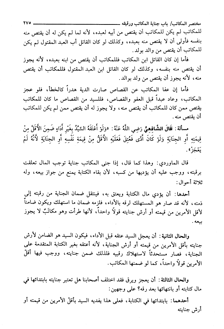 قَالَ الْمَاوَرْدِيُّ: وَهَذَا كَمَا قَالَ، إِذَا جَنَى الْمُكَاتَبُ جِنَايَةً تُوجِبُ الْمَالَ تَعَلَّقَتْ بِرَقَبَتِهِ، وَوَجَبَ عَلَيْهِ أَنْ يُؤَدِّيَهَا مِنْ كَسْبِهِ، لِأَنَّ بَقَاءَ الْكِتَابَةِ يَمْنَعُ مِنْ جواز بيعه، وله ثلاثة أَحْوَالٍ: