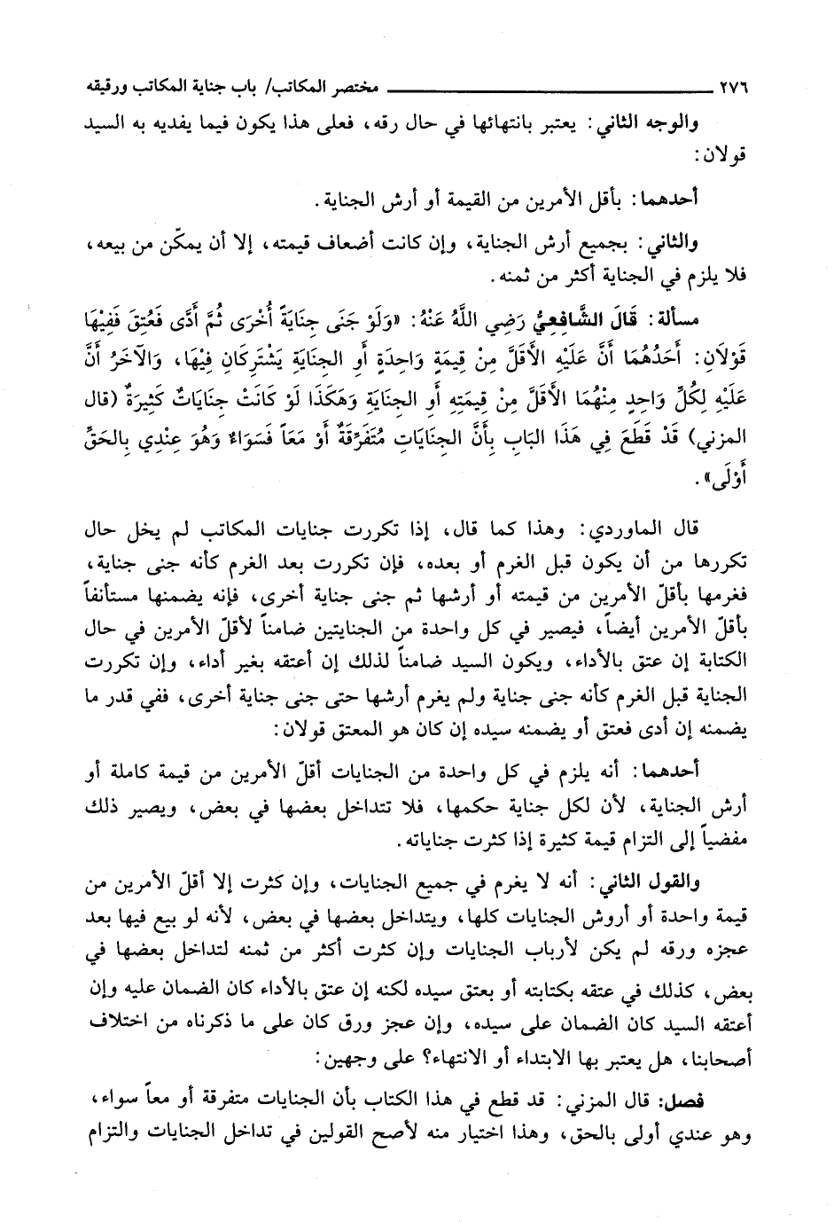 قَالَ الْمَاوَرْدِيُّ: وَهَذَا كَمَا قَالَ، إِذَا تَكَرَّرَتْ جِنَايَاتُ الْمُكَاتَبِ لَمْ يَخْلُ حَالُ تُكَرُّرِهَا مِنْ أَنْ يَكُونَ قَبْلَ الْغُرْمِ أَوْ بَعْدَهُ، فَإِنْ تَكَرَّرَتْ بَعْدَ الْغُرْمِ كَأَنَّهُ جَنَى جِنَايَةً، فَغَرِمَهَا بِأَقَلِّ الْأَمْرَيْنِ مِنْ قِيمَتِهِ أَوْ أَرْشِهَا ثُمَّ جَنَى جِنَايَةً أُخْرَى، فَإِنَّهُ يَضْمَنُهَا مُسْتَأْنِفًا بِأَقَلِّ الْأَمْرَيْنِ أَيْضًا، فَيَصِيرُ فِي كُلِّ وَاحِدَةٍ مِنَ الْجِنَايَتَيْنِ ضَامِنًا لِأَقَلِّ الْأَمْرَيْنِ فِي حَالِ الْكِتَابَةِ إِنْ عَتَقَ بِالْأَدَاءِ، وَيَكُونُ السَّيِّدُ ضَامِنًا لِذَلِكَ إِنْ أَعْتَقَهُ بِغَيْرِ أَدَاءٍ، وَإِنْ تَكَرَّرَتِ الْجِنَايَةُ قَبْلَ الْغُرْمِ كَأَنَّهُ جَنَى جِنَايَةً وَلَمْ يُغَرَّمْ أَرْشَهَا حَتَّى جَنَى جِنَايَةً أُخْرَى، فَفِي قَدْرِ مَا يَضْمَنُهُ إِنْ أَدَّى فَعَتَقَ أَوْ يَضْمَنُهُ سَيِّدُهُ إِنْ كَانَ هُوَ الْمُعْتِقُ قَوْلَانِ: