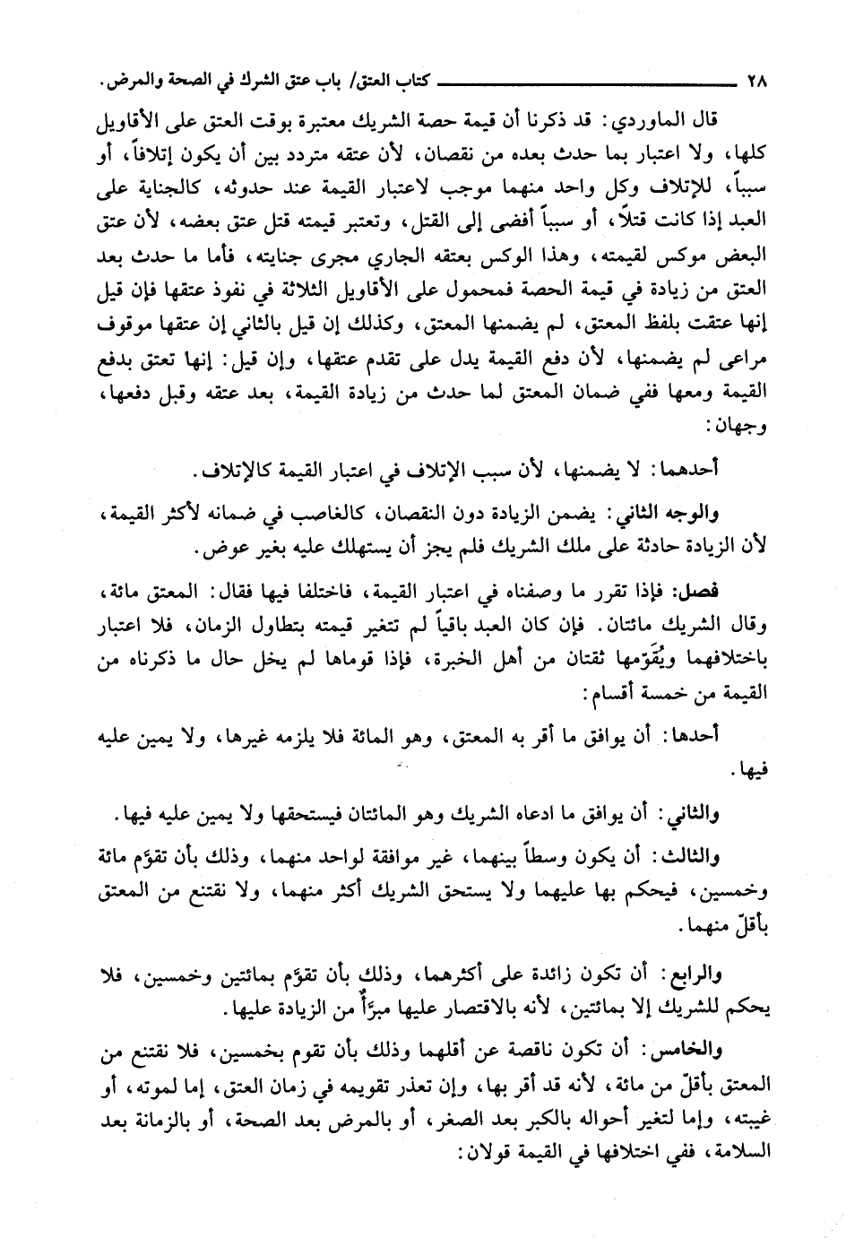 قَالَ الْمَاوَرْدِيُّ: قَدْ ذَكَرْنَا أَنَّ قِيمَةَ حِصَّةِ الشريك معتبرة بوقت العتق على الأقاويل كلها، وَلَا اعْتِبَارَ بِمَا حَدَثَ بَعْدَهُ مِنْ نُقْصَانٍ، لِأَنَّ عِتْقَهُ مُتَرَدِّدٌ بَيْنَ أَنْ يَكُونَ إِتْلَافًا، أَوْ سَبَبًا، لِلْإِتْلَافٍ وَكُلُّ وَاحِدٍ مِنْهُمَا مُوجِبٌ لِاعْتِبَارِ الْقِيمَةِ عِنْدَ حُدُوثِهِ، كَالْجِنَايَةِ عَلَى الْعَبْدِ إذا كانت قتلا، أو سببنا أفضى إلى القتل، وتعتبر قيمته قتل عِتْقِ بَعْضِهِ، لِأَنَّ عِتْقَ الْبَعْضِ مُوكِسٌ لِقِيمَتِهِ، وَهَذَا الْوَكْسُ بِعِتْقِهِ الْجَارِي مَجْرَى جِنَايَتِهِ، فَأَمَّا مَا حَدَثَ بَعْدَ الْعِتْقِ مِنْ زِيَادَةٍ فِي قِيمَةِ الْحِصَّةِ فَمَحْمُولٌ عَلَى الْأَقَاوِيلِ الثَّلَاثَةِ فِي نُفُوذِ عِتْقِهَا فَإِنْ قِيلَ إِنَّهَا عَتَقَتْ بِلَفْظِ الْمُعْتِقِ، لَمْ يَضْمَنْهَا الْمُعْتِقُ، وَكَذَلِكَ إِنْ قِيلَ بِالثَّانِي إِنَّ عِتْقَهَا مَوْقُوفٌ مُرَاعًى لَمْ يَضْمَنْهَا، لِأَنَّ دَفْعَ الْقِيمَةِ يَدُلُّ عَلَى تَقَدُّمِ عِتْقِهَا، وَإِنْ قِيلَ: إِنَّهَا تُعْتَقُ بِدَفْعِ الْقِيمَةِ وَمَعَهَا فَفِي ضَمَانِ الْمُعْتِقِ لِمَا حَدَثَ مِنْ زِيَادَةِ الْقِيمَةِ، بَعْدَ عِتْقِهِ وَقَبْلَ دَفْعِهَا، وَجْهَانِ: