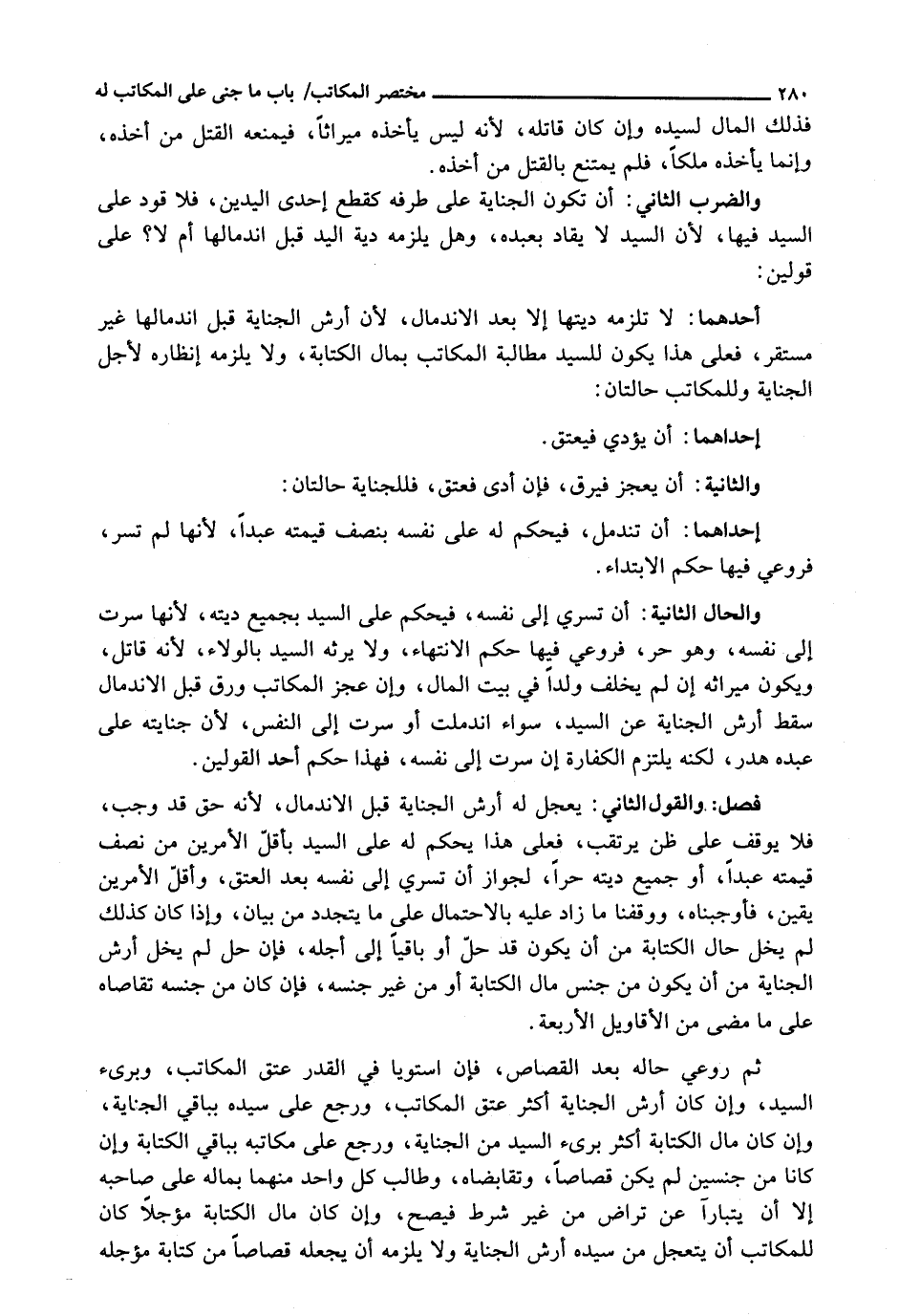 ثُمَّ رُوعِيَ حَالُهُ بَعْدَ الْقِصَاصِ، فَإِنِ اسْتَوَيَا فِي الْقَدْرِ عَتَقَ الْمُكَاتَبُ، وَبَرِئَ السَّيِّدُ، وَإِنْ كَانَ أَرْشُ الْجِنَايَةِ أَكْثَرَ عَتَقَ الْمُكَاتَبُ، وَرَجَعَ عَلَى سَيِّدِهِ بِبَاقِي الْجِنَايَةِ، وَإِنْ كَانَ مَالُ الْكِتَابَةِ أَكْثَرَ بَرِئَ السَّيِّدُ مِنَ الْجِنَايَةِ، وَرَجَعَ عَلَى مُكَاتَبِهِ بِبَاقِي الْكِتَابَةِ وَإِنْ كَانَا مِنْ جِنْسَيْنِ لَمْ يَكُنْ قِصَاصًا، وَتَقَابَضَاهُ، وَطَالَبَ كُلُّ وَاحِدٍ مِنْهُمَا بِمَالِهِ عَلَى صَاحِبِهِ إلا أن يتبارا عَنْ تَرَاضٍ مِنْ غَيْرِ شَرْطٍ فَيَصِحَّ، وَإِنْ كَانَ مَالُ الْكِتَابَةِ مُؤَجَّلًا كَانَ لِلْمُكَاتَبِ أَنْ يَتَعَجَّلَ مِنْ سَيِّدِهِ أَرْشَ الْجِنَايَةِ وَلَا يَلْزَمُهُ أَنْ يَجْعَلَهُ قِصَاصًا مِنْ كِتَابَةٍ مُؤَجَّلَةٍ