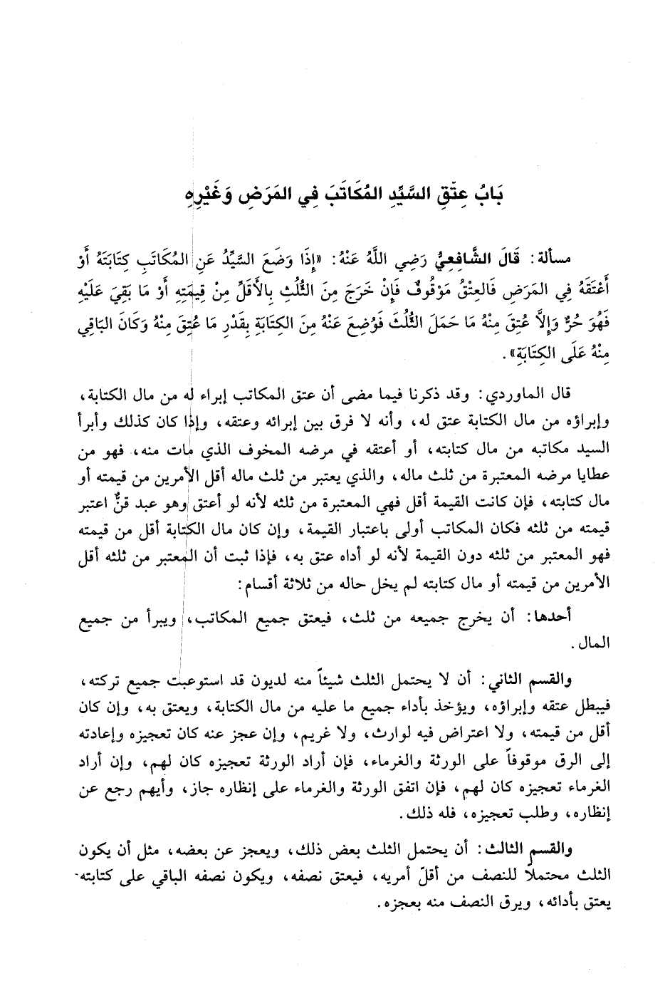 قَالَ الْمَاوَرْدِيُّ: وَقَدْ ذَكَرْنَا فِيمَا مَضَى أَنَّ عِتْقَ الْمُكَاتَبِ إِبْرَاءٌ لَهُ مِنْ مَالِ الْكِتَابَةِ، وَإِبْرَاؤُهُ مِنْ مَالِ الْكِتَابَةِ عِتْقٌ لَهُ، وَأَنَّهُ لَا فَرْقَ بَيْنَ إِبْرَائِهِ وَعِتْقِهِ، وَإِذَا كَانَ كَذَلِكَ وَأَبْرَأَ السَّيِّدُ مُكَاتَبَهُ مِنْ مَالِ كِتَابَتِهِ، أَوْ أَعْتَقَهُ فِي مَرَضِهِ الْمُخَوِّفِ الَّذِي مَاتَ مِنْهُ، فَهُوَ مِنْ عَطَايَا مَرَضِهِ الْمُعْتَبَرَةِ مِنْ ثُلُثِ مَالِهِ، وَالَّذِي يُعْتَبَرُ مِنْ ثُلُثِ مَالِهِ أَقَلَّ الْأَمْرَيْنِ مِنْ قِيمَتِهِ أَوْ مَالِ كِتَابَتِهِ، فَإِنْ كَانَتِ الْقِيمَةُ أَقَلَّ فَهِيَ الْمُعْتَبَرَةُ مِنْ ثُلُثِهِ لِأَنَّهُ لَوْ أَعْتَقَ وَهُوَ عَبْدٌ قِنٌّ اعْتَبَرَ قِيمَتَهُ مِنْ ثُلُثِهِ فَكَانَ الْمُكَاتَبُ أَوْلَى بِاعْتِبَارِ الْقِيمَةِ، وَإِنْ كَانَ مَالُ الْكِتَابَةِ أَقَلَّ مِنْ قِيمَتِهِ فَهُوَ الْمُعْتَبَرُ مِنْ ثُلُثِهِ دُونَ الْقِيمَةِ لِأَنَّهُ لَوْ أَدَّاهُ عَتَقَ بِهِ، فَإِذَا ثَبَتَ أَنَّ الْمُعْتَبَرَ مِنْ ثُلُثِهِ أَقَلَّ الْأَمْرَيْنِ مِنْ قِيمَتِهِ أَوْ مَالِ كِتَابَتِهِ لَمْ يَخْلُ حَالُهُ مِنْ ثَلَاثَةِ أَقْسَامٍ: