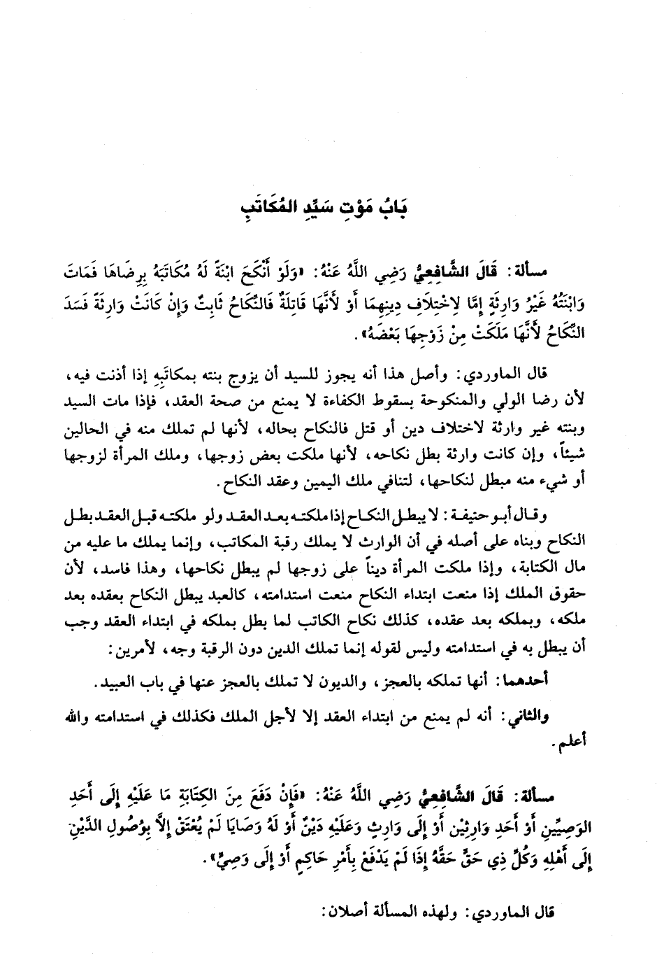 قال الشافعي رضي الله عنه: (وَلَوْ أَنْكَحَ ابْنَةً لَهُ مُكَاتَبَهُ بِرِضَاهَا فَمَاتَ وَابْنَتُهُ غَيْرُ وَارِثَةٍ إِمَّا لِاخْتِلَافِ دِينِهِمَا أَوْ لِأَنَّهَا قَاتِلَةٌ فَالنِّكَاحُ ثَابِتٌ وَإِنْ كَانَتْ وَارِثَةً فَسَدَ النِّكَاحُ لِأَنَّهَا مَلَكَتْ مِنْ زَوْجِهَا بَعْضَهُ) . قَالَ الْمَاوَرْدِيُّ: وَأَصْلُ هَذَا أَنَّهُ يَجُوزُ لِلسَّيِّدِ أَنْ يُزَوِّجَ بِنْتَهُ بِمُكَاتَبِهِ إِذَا أَذِنَتْ فِيهِ، لِأَنَّ رِضَا الْوَلِيِّ وَالْمَنْكُوحَةِ بِسُقُوطِ الْكَفَاءَةِ لَا يَمْنَعُ مِنْ صِحَّةِ الْعَقْدِ، فَإِذَا مَاتَ السَّيِّدُ وَبِنْتُهُ غَيْرُ وَارِثَةٍ لِاخْتِلَافِ دِينٍ أَوْ قَتْلٍ فَالنِّكَاحُ بِحَالِهِ، لِأَنَّهَا لَمْ تَمْلِكْ مِنْهُ فِي الْحَالَيْنِ شَيْئًا، وَإِنْ كَانَتْ وَارِثَةً بَطَلَ نِكَاحُهُ، لِأَنَّهَا مَلَكَتْ بَعْضَ زَوْجِهَا، وَمِلْكُ الْمَرْأَةِ لِزَوْجِهَا أَوْ شَيْءٍ مِنْهُ مُبْطِلٌ لِنِكَاحِهَا، لِتَنَافِي مِلْكِ الْيَمِينِ وَعَقْدِ النِّكَاحِ.