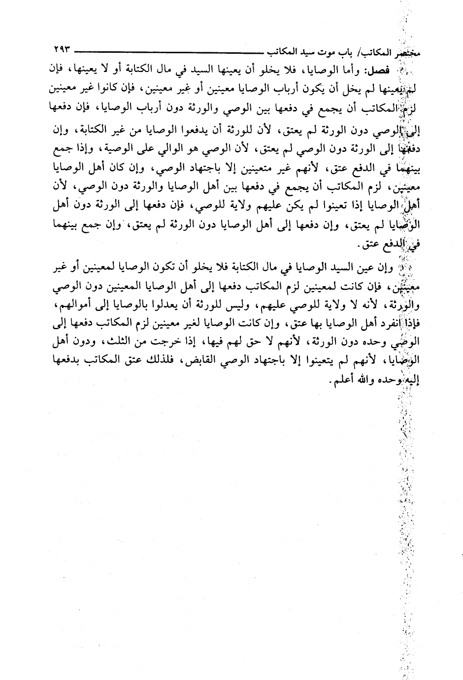 وأما الوصايا، فلا يخلوا أَنْ يُعَيِّنَهَا السَّيِّدُ فِي مَالِ الْكِتَابَةِ أَوْ لَا يُعَيِّنَهَا، فَإِنْ لَمْ يُعَيِّنْهَا لَمْ يَخْلُ أَنْ يَكُونَ أَرْبَابُ الْوَصَايَا مُعَيَّنِينَ أَوْ غَيْرَ مُعَيَّنِينَ، فَإِنْ كَانُوا غَيْرَ مُعَيَّنِينَ لَزِمَ الْمُكَاتَبُ أَنْ يَجْمَعَ فِي دَفْعِهَا بَيْنَ الْوَصِيِّ وَالْوَرَثَةِ دُونَ أَرْبَابِ الْوَصَايَا، فَإِنْ دَفَعَهَا إِلَى الْوَصِيِّ دُونَ الْوَرَثَةِ لَمْ يُعْتَقْ، لِأَنَّ لِلْوَرَثَةِ أَنْ يَدْفَعُوا الْوَصَايَا مِنْ غَيْرِ الْكِتَابَةِ، وَإِنْ دَفَعَهَا إِلَى الْوَرَثَةِ دُونَ الْوَصِيِّ لَمْ يُعْتَقْ، لِأَنَّ الْوَصِيَّ هُوَ الْوَالِي عَلَى الْوَصِيَّةِ، وَإِذَا جَمَعَ بَيْنَهُمَا فِي الدَّفْعِ عَتَقَ، لِأَنَّهُمْ غَيْرُ مُتَعَيِّنِينَ إِلَّا بِاجْتِهَادِ الْوَصِيِّ، وَإِنْ كَانَ أَهْلُ الْوَصَايَا مُعَيَّنِينَ، لَزِمَ الْمُكَاتَبُ أَنْ يَجْمَعَ فِي دَفْعِهَا بَيْنَ أَهْلِ الْوَصَايَا وَالْوَرَثَةِ دُونَ الْوَصِيِّ، لِأَنَّ أَهْلَ الْوَصَايَا إِذَا تَعَيَّنُوا لَمْ يَكُنْ عَلَيْهِمْ وِلَايَةٌ لِلْوَصِيِّ، فَإِنْ دَفَعَهَا إِلَى الْوَرَثَةِ دُونَ أَهْلِ الْوَصَايَا لَمْ يُعْتَقْ، وَإِنْ دَفَعَهَا إِلَى أَهْلِ الْوَصَايَا دُونَ الْوَرَثَةِ لَمْ يُعْتَقْ، وَإِنْ جَمَعَ بَيْنَهُمَا فِي الدَّفْعِ عَتَقَ.
