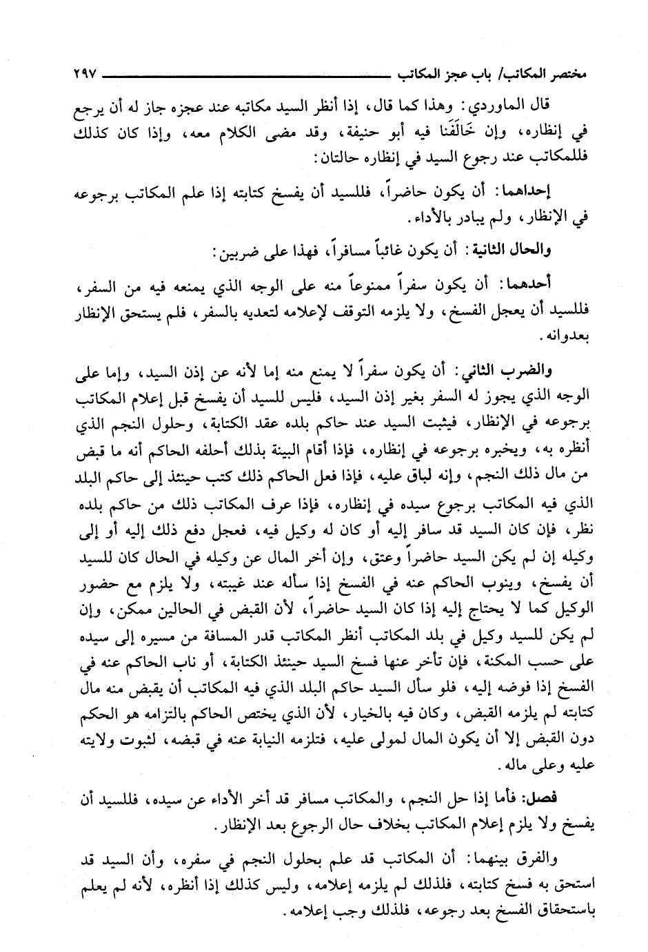 وَالضَّرْبُ الثَّانِي: أَنْ يَكُونَ سَفَرًا لَا يُمْنَعُ مِنْهُ إِمَّا لِأَنَّهُ عَنْ إِذْنِ السَّيِّدُ، وَإِمَّا عَلَى الْوَجْهِ الَّذِي يَجُوزُ لَهُ السَّفَرُ بِغَيْرِ إِذْنِ السَّيِّدِ، فَلَيْسَ لِلسَّيِّدِ أَنْ يَفْسَخَ قَبْلَ إِعْلَامِ الْمُكَاتَبِ بِرُجُوعِهِ فِي الْإِنْظَارِ، فَيُثْبِتُ السَّيِّدُ عِنْدَ حَاكِمِ بَلَدِهِ عَقْدَ الْكِتَابَةِ، وَحُلُولَ النَّجْمِ الَّذِي أَنْظَرَهُ بِهِ، وَيُخْبِرُهُ بِرُجُوعِهِ فِي إِنْظَارِهِ، فَإِذَا أَقَامَ الْبَيِّنَةَ بِذَلِكَ أَحْلَفَهُ الْحَاكِمُ إنَّهُ مَا قَبَضَ مِنْ مَالِ ذَلِكَ النَّجْمِ، وَإِنَّهُ لِبَاقٍ عَلَيْهِ، فَإِذَا فَعَلَ الْحَاكِمُ ذَلِكَ كَتَبَ حِينَئِذٍ إِلَى حَاكِمِ الْبَلَدِ الَّذِي فِيهِ الْمُكَاتَبُ بِرُجُوعِ سَيِّدِهِ إفي إِنْظَارِهِ، فَإِذَا عَرَفَ الْمُكَاتَبُ ذَلِكَ مِنْ حَاكِمِ بَلَدِهِ نُظِرَ، فَإِنْ كَانَ السَّيِّدُ قَدْ سَافَرَ إِلَيْهِ أَوْ كَانَ لَهُ وَكِيلٌ فِيهِ، فَعَجَّلَ دَفْعَ ذَلِكَ إِلَيْهِ أَوْ إِلَى وَكِيلِهِ إِنْ لَمْ يَكُنِ السَّيِّدُ حَاضِرًا وَعَتَقَ، وَإِنْ أَخَّرَ الْمَالَ عَنْ وَكِيلِهِ فِي الْحَالِ كَانَ لِلسَّيِّدِ أَنْ يَفْسَخَ، وَيَنُوبُ الْحَاكِمُ عَنْهُ فِي الْفَسْخِ إِذَا سَأَلَهُ عِنْدَ غَيْبَتِهِ، وَلَا يَلْزَمُ مَعَ حُضُورِ الْوَكِيلِ كَمَا لَا يَحْتَاجُ إِلَيْهِ إِذَا كَانَ السَّيِّدُ حَاضِرًا، لِأَنَّ الْقَبْضَ فِي الْحَالَيْنِ مُمْكِنٌ، وَإِنْ لَمْ يَكُنْ لِلسَّيِّدِ وَكِيلٌ فِي بَلَدِ الْمُكَاتَبِ أُنْظِرَ الْمُكَاتَبُ قَدْرَ الْمَسَافَةِ مِنْ مِسِيرِهِ إِلَى سَيِّدِهِ عَلَى حَسَبِ الْمَكِنَةِ، فَإِنْ تَأَخَّرَ عَنْهَا فَسَخَ السَّيِّدُ حِينَئِذٍ الْكِتَابَةَ، أَوْ نَابَ الْحَاكِمُ عَنْهُ فِي الْفَسْخِ إِذَا فَوَّضَهُ إِلَيْهِ، فَلَوْ سَأَلَ، السَّيِّدُ حَاكِمَ الْبَلَدِ الَّذِي فِيهِ الْمُكَاتَبُ أَنْ يَقْبِضَ مِنْهُ مَالَ كِتَابَتِهِ لَمْ يَلْزَمْهُ الْقَبْضُ، وَكَانَ فِيهِ بِالْخِيَارِ، لِأَنَّ الَّذِي يَخْتَصُّ الْحَاكِمُ بِالْتِزَامِهِ هُوَ الْحُكْمُ دُونَ الْقَبْضِ إِلَّا أَنْ يَكُونَ الْمَالُ لِمَوْلًى عَلَيْهِ، فَتَلْزَمُهُ النِّيَابَةُ عَنْهُ فِي قَبْضِهِ، لِثُبُوتِ وِلَايَتِهِ عَلَيْهِ وَعَلَى مَالِهِ.