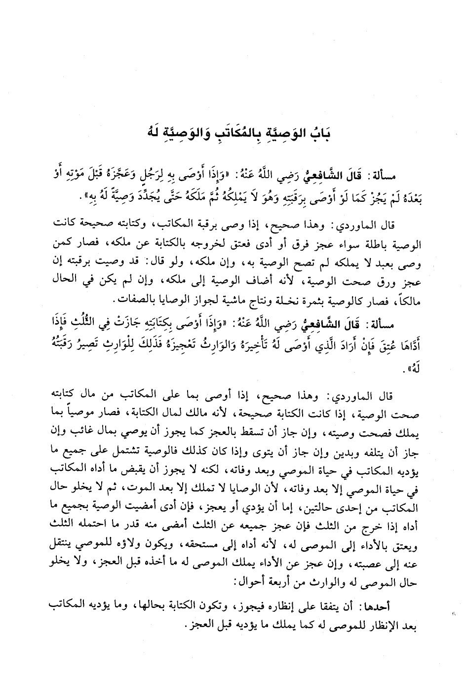 قَالَ الْمَاوَرْدِيُّ: وَهَذَا صَحِيحٌ، إِذَا وَصَّى بِرَقَبَةِ الْمُكَاتَبِ، وَكِتَابَتُهُ صَحِيحَةٌ كَانَتِ الْوَصِيَّةُ بَاطِلَةً سَوَاءٌ عَجَزَ فَرَقَّ أَوْ أَدَّى فَعَتَقَ لِخُرُوجِهِ بِالْكِتَابَةِ عَنْ مِلْكِهِ، فَصَارَ كَمَنْ وَصَّى بِعَبْدٍ لَا يَمْلِكُهُ لَمْ تَصِحَّ الْوَصِيَّةُ بِهِ، وَإِنْ مَلَكَهُ، وَلَوْ قَالَ: قَدْ وَصَّيْتُ بِرَقَبَتِهِ إِنْ عَجَزَ وَرَقَّ صَحَّتِ الْوَصِيَّةُ، لِأَنَّهُ أَضَافَ الْوَصِيَّةَ إِلَى مِلْكِهِ، وَإِنْ لَمْ يَكُنْ فِي الْحَالِ مَالِكًا، فَصَارَ كَالْوَصِيَّةِ بِثَمَرَةِ نَخْلَةٍ وَنِتَاجِ مَاشِيَةٍ لِجَوَازِ الْوَصَايَا بِالصِّفَاتِ.