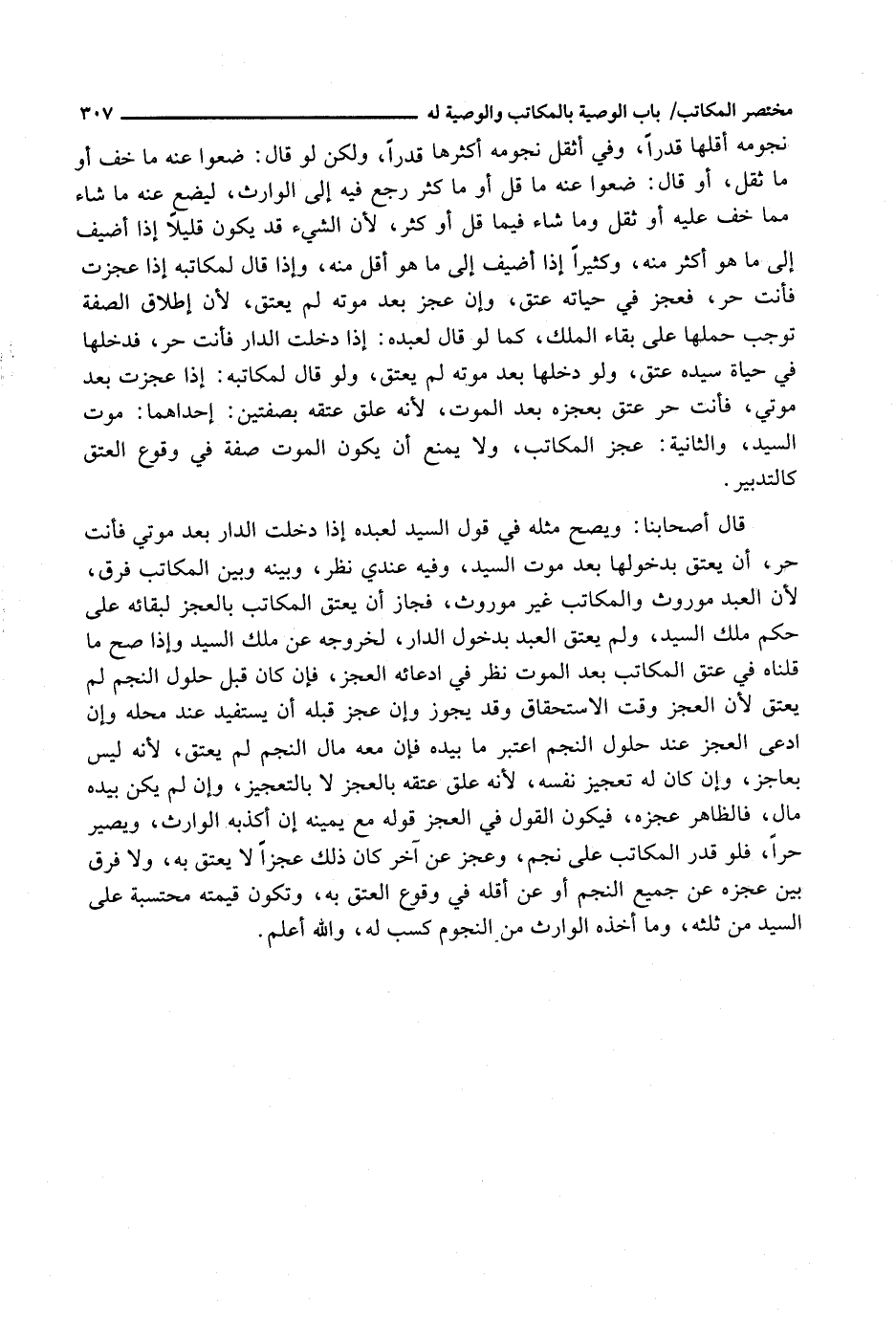قَالَ أَصْحَابُنَا: وَيَصِحُّ مِثْلُهُ فِي قَوْلِ السَّيِّدِ لِعَبْدِهِ إِذَا دَخَلْتَ الدَّارَ بَعْدَ مَوْتِي فَأَنْتَ حُرٌّ، أَنْ يَعْتِقَ بِدُخُولِهَا بَعْدَ مَوْتِ السَّيِّدِ، وَفِيهِ عِنْدِي نَظَرٌ، وَبَيْنَهُ وَبَيْنَ الْمُكَاتَبِ فَرْقٌ لِأَنَّ الْعَبْدَ مَوْرُوثٌ وَالْمُكَاتَبَ غَيْرُ مَوْرُوثٍ، فَجَازَ أَنْ يُعْتَقَ الْمُكَاتَبُ بِالْعَجْزِ لِبَقَائِهِ عَلَى حُكْمِ مِلْكِ السَّيِّدِ، وَلَمْ يُعْتَقِ الْعَبْدُ بِدُخُولِ الدَّارِ، لِخُرُوجِهِ عَنْ مِلْكِ السَّيِّدِ وَإِذَا صَحَّ مَا قُلْنَاهُ فِي عِتْقِ الْمُكَاتَبِ بَعْدَ الْمَوْتِ نُظِرَ فِي ادِّعَائِهِ الْعَجْزَ، فَإِنْ كَانَ قَبْلَ حُلُولِ النَّجْمِ لَمْ يُعْتَقْ لِأَنَّ الْعَجْزَ وَقْتَ الِاسْتِحْقَاقِ وَقَدْ يَجُوزُ وَإِنْ عَجَزَ قَبْلَهُ أَنْ يَسْتَفِيدَ عِنْدَ مَحَلِّهِ وَإِنِ ادَّعَى الْعَجْزَ عِنْدَ حُلُولِ النَّجْمِ اعْتَبَرَ مَا بِيَدِهِ فَإِنَّ مَعَهُ مَالَ النَّجْمِ لَمْ يُعْتَقْ، لِأَنَّهُ لَيْسَ بِعَاجِزٍ، وَإِنْ كَانَ لَهُ تَعْجِيزُ نَفْسِهِ، لِأَنَّهُ عَلَّقَ عِتْقَهُ بِالْعَجْزِ لَا بِالتَّعْجِيزِ، وَإِنْ لَمْ يَكُنْ بِيَدِهِ مَالٌ، فَالظَّاهِرُ عَجْزُهُ، فَيَكُونُ الْقَوْلُ فِي الْعَجْزِ قَوْلُهُ مَعَ يَمِينِهِ إِنْ أَكْذَبَهُ الْوَارِثُ، وَيَصِيرُ حُرًّا، فَلَوْ قَدَرَ الْمُكَاتَبُ عَلَى نَجْمٍ، وَعَجَزَ عَنْ آخَرَ كَانَ ذَلِكَ عَجْزًا لَا يُعْتَقُ بِهِ، وَلَا فَرْقَ بَيْنَ عَجْزِهِ عَنْ جَمِيعِ النَّجْمِ أَوْ عَنْ أَقَلِّهِ فِي وُقُوعِ الْعِتْقِ بِهِ، وَتَكُونُ قِيمَتُهُ مُحْتَسَبَةً عَلَى السَّيِّدِ مِنْ ثُلُثِهِ، وَمَا أَخَذَهُ الْوَارِثُ مِنَ النُّجُومِ كَسْبٌ لَهُ، وَاللَّهُ أَعْلَمُ.