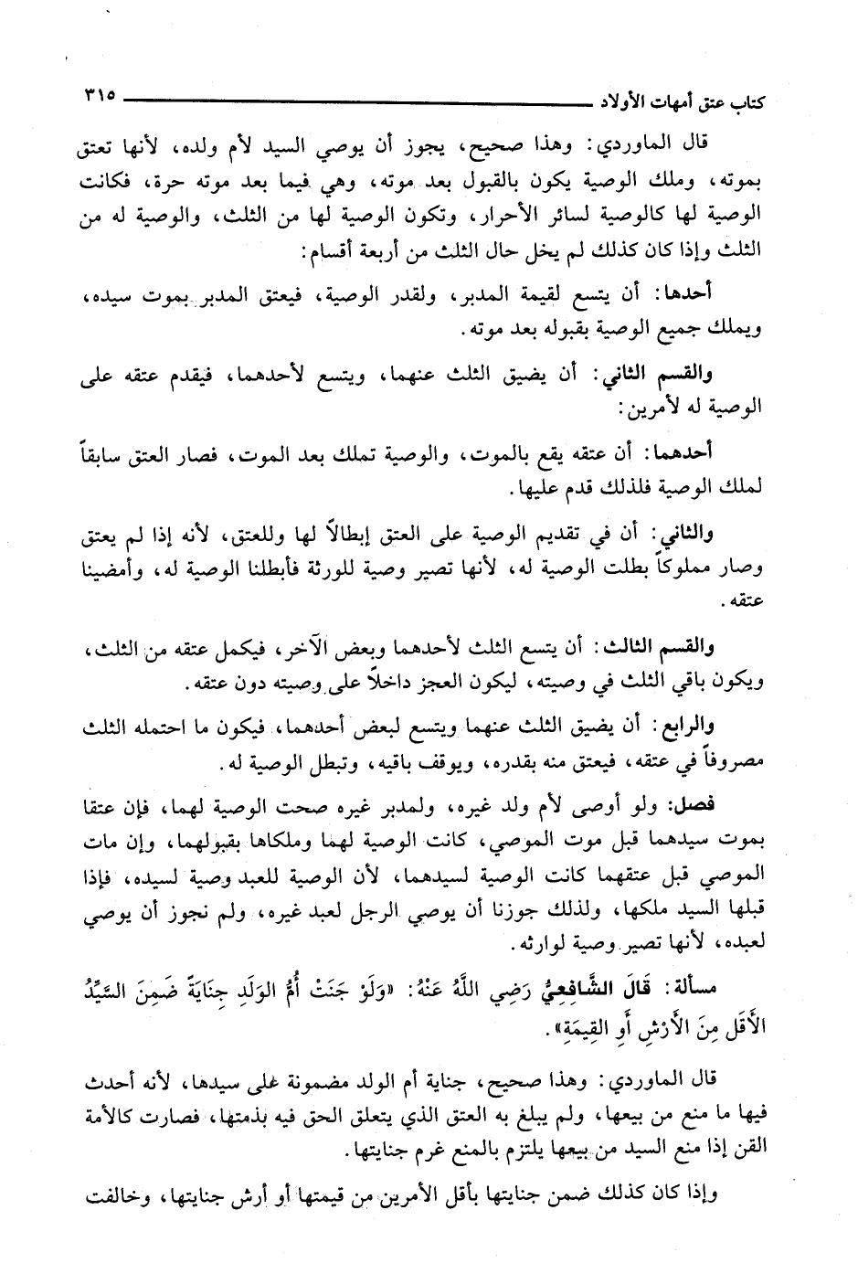 قَالَ الْمَاوَرْدِيُّ: وَهَذَا صَحِيحٌ، يَجُوزُ أَنْ يُوصِيَ السَّيِّدُ لِأُمِّ وَلَدِهِ، لِأَنَّهَا تُعْتَقُ بِمَوْتِهِ، وَمِلْكُ الْوَصِيَّةِ يَكُونُ بِالْقَبُولِ بَعْدَ مَوْتِهِ، وَهِيَ فِيمَا بَعْدَ مَوْتِهِ حُرَّةٌ، فَكَانَتِ الْوَصِيَّةُ لَهَا كَالْوَصِيَّةِ لِسَائِرِ الْأَحْرَارِ، وَتَكُونُ الْوَصِيَّةُ لَهَا مِنَ الثُّلُثِ، وَالْوَصِيَّةُ لَهُ مِنَ الثُّلُثِ وَإِذَا كَانَ كَذَلِكَ لَمْ يَخْلُ حَالُ الثُّلُثِ مِنْ أَرْبَعَةِ أَقْسَامٍ: