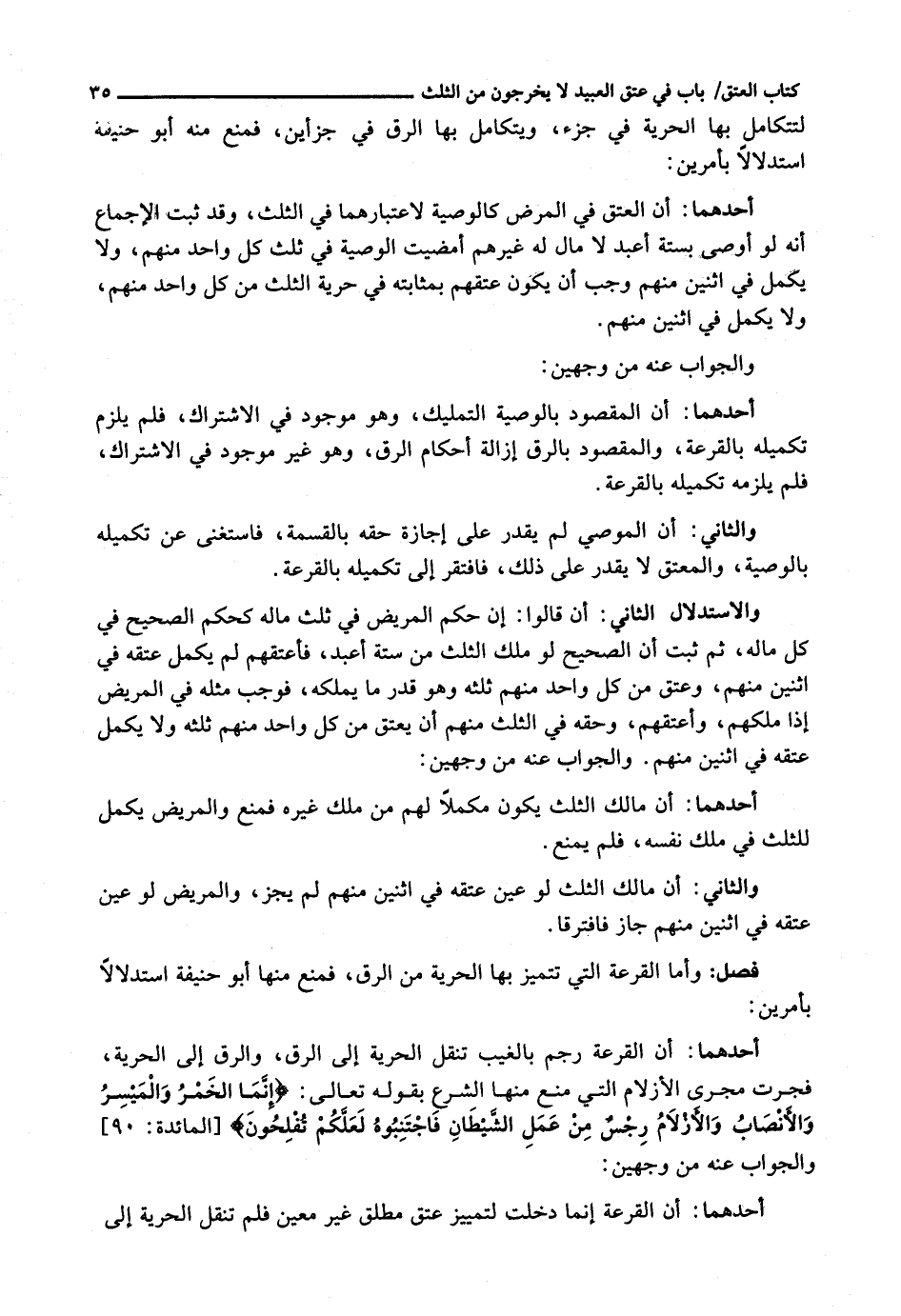 وَالِاسْتِدْلَالُ الثَّانِي: أَنْ قَالُوا: إِنَّ حُكْمَ الْمَرِيضِ فِي ثُلُثِ مَالِهِ كَحُكْمِ الصَّحِيحِ فِي كُلِّ مَالِهِ، ثُمَّ ثَبَتَ أَنَّ الصَّحِيحَ لَوْ مَلَكَ الثُّلُثَ مِنْ سِتَّةِ أَعْبُدٍ، فَأَعْتَقَهُمْ لَمْ يَكْمُلْ عِتْقُهُ فِي اثْنَيْنِ مِنْهُمْ، وَعَتَقَ مِنْ كُلِّ وَاحِدٍ مِنْهُمْ ثُلُثَهَ وَهُوَ قَدْرُ مَا يَمْلِكُهُ، فَوَجَبَ مِثْلُهُ فِي الْمَرِيضِ إِذَا مَلَكَهُمْ، وَأَعْتَقَهُمْ، وَحَقُّهُ فِي الثُّلُثِ مِنْهُمْ أَنْ يَعْتِقَ مِنْ كُلِّ وَاحِدٍ مِنْهُمْ ثُلُثَهُ وَلَا يَكْمُلُ عِتْقُهُ فِي اثْنَيْنِ مِنْهُمْ. وَالْجَوَابُ عَنْهُ مِنْ وَجْهَيْنِ:
