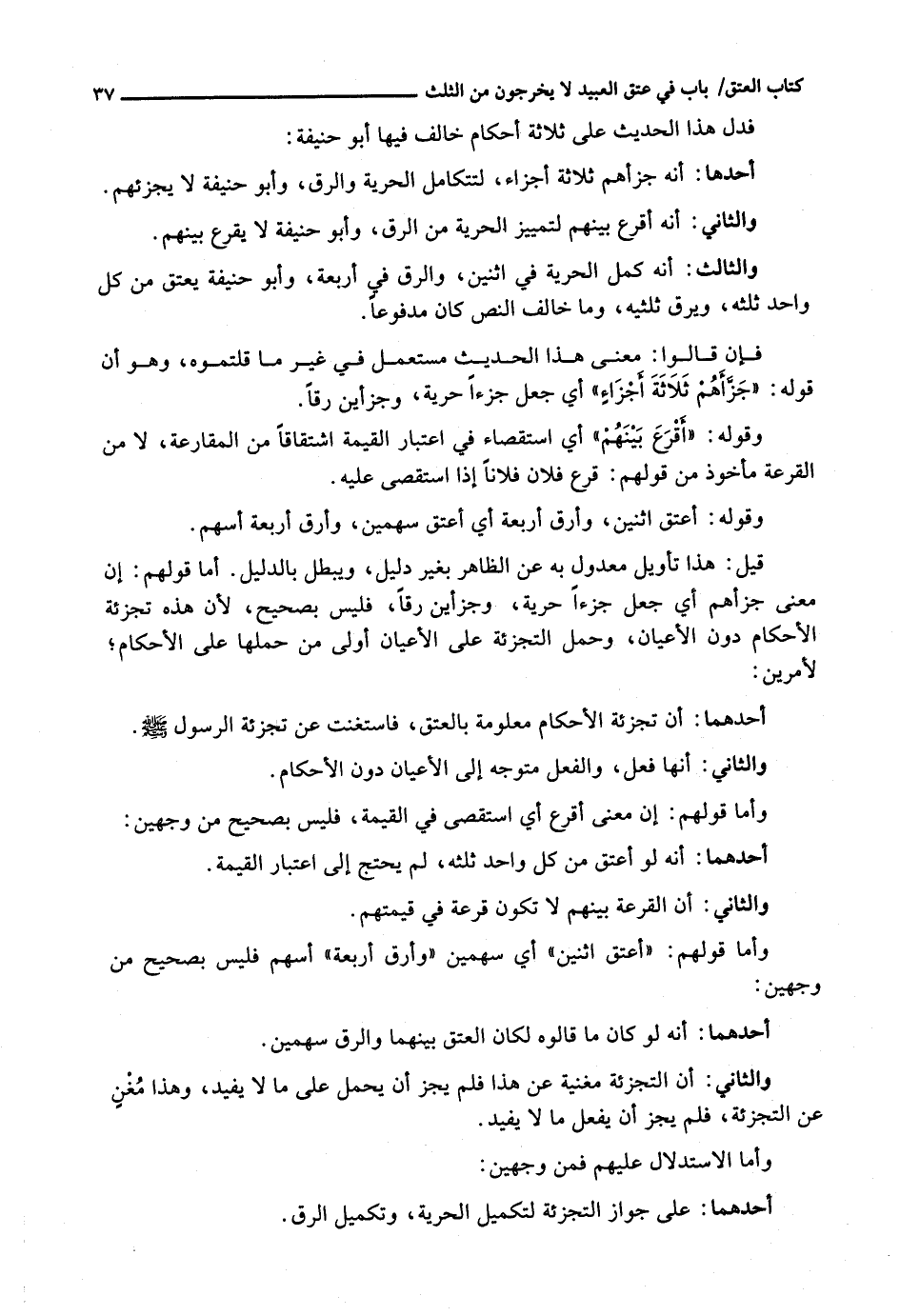 أَحَدُهُمَا: أَنَّ تَجْزِئَةَ الْأَحْكَامِ مَعْلُومَةٌ بِالْعِتْقِ، فَاسْتَغْنَتْ عَنْ تَجْزِئَةِ الرَّسُولِ - صَلَّى اللَّهُ عَلَيْهِ وَسَلَّم َ -.