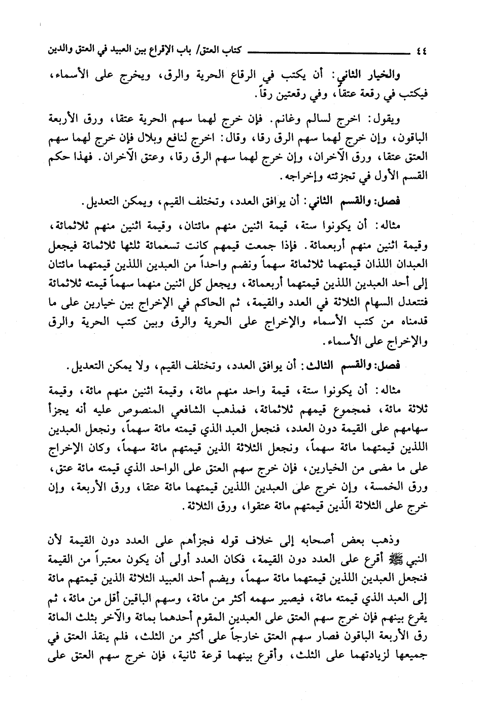 وَذَهَبَ بَعْضُ أَصْحَابِهِ إِلَى خِلَافِ قَوْلِهِ فَجَزَّأَهُمْ عَلَى الْعَدَدِ دُونَ الْقِيمَةِ لِأَنَّ النَّبِيَّ - صَلَّى اللَّهُ عَلَيْهِ وَسَلَّم َ - أَقْرَع عَلَى الْعَدَدِ دُونَ الْقِيمَةِ، فَكَانَ الْعَدَدُ أَوْلَى أَنْ يَكُونَ مُعْتَبَرًا مِنَ الْقِيمَةِ فَنَجْعَلُ الْعَبْدَيْنِ اللَّذَيْنِ قِيمَتُهُمَا مِائَةٌ سَهْمًا، وَيُضَمُّ أَحَدُ الْعَبِيدِ الثَّلَاثَةِ الَّذِينَ قِيمَتُهُمْ مِائَةٌ إِلَى الْعَبْدِ الَّذِي قِيمَتْهُ مِائَةٌ، فَيَصِيرُ سَهْمُهُ أَكْثَرَ مِنْ مِائَةٍ، وَسَهْمُ الْبَاقِينَ أَقَلَّ مِنْ مِائَةٍ، ثُمَّ يُقْرَعُ بَيْنَهُمْ فَإِنْ خَرَجَ سَهْمُ الْعِتْقِ عَلَى الْعَبْدَيْنِ الْمُقَوَّمِ أَحَدُهُمَا بِمِائَةٍ وَالْآخَرُ بِثُلُثِ الْمِائَةِ رَقَّ الْأَرْبَعَةُ الْبَاقُونَ فَصَارَ سَهْمُ الْعِتْقِ خَارِجًا على أكثر من الثلث، فلم ينقذ الْعِتْقُ فِي جَمِيعِهَا لِزِيَادَتِهِمَا عَلَى الثُّلُثِ، وَأَقْرَعَ بَيْنَهُمَا قُرْعَةً ثَانِيَةً، فَإِنْ خَرَجَ سَهْمُ الْعِتْقِ على