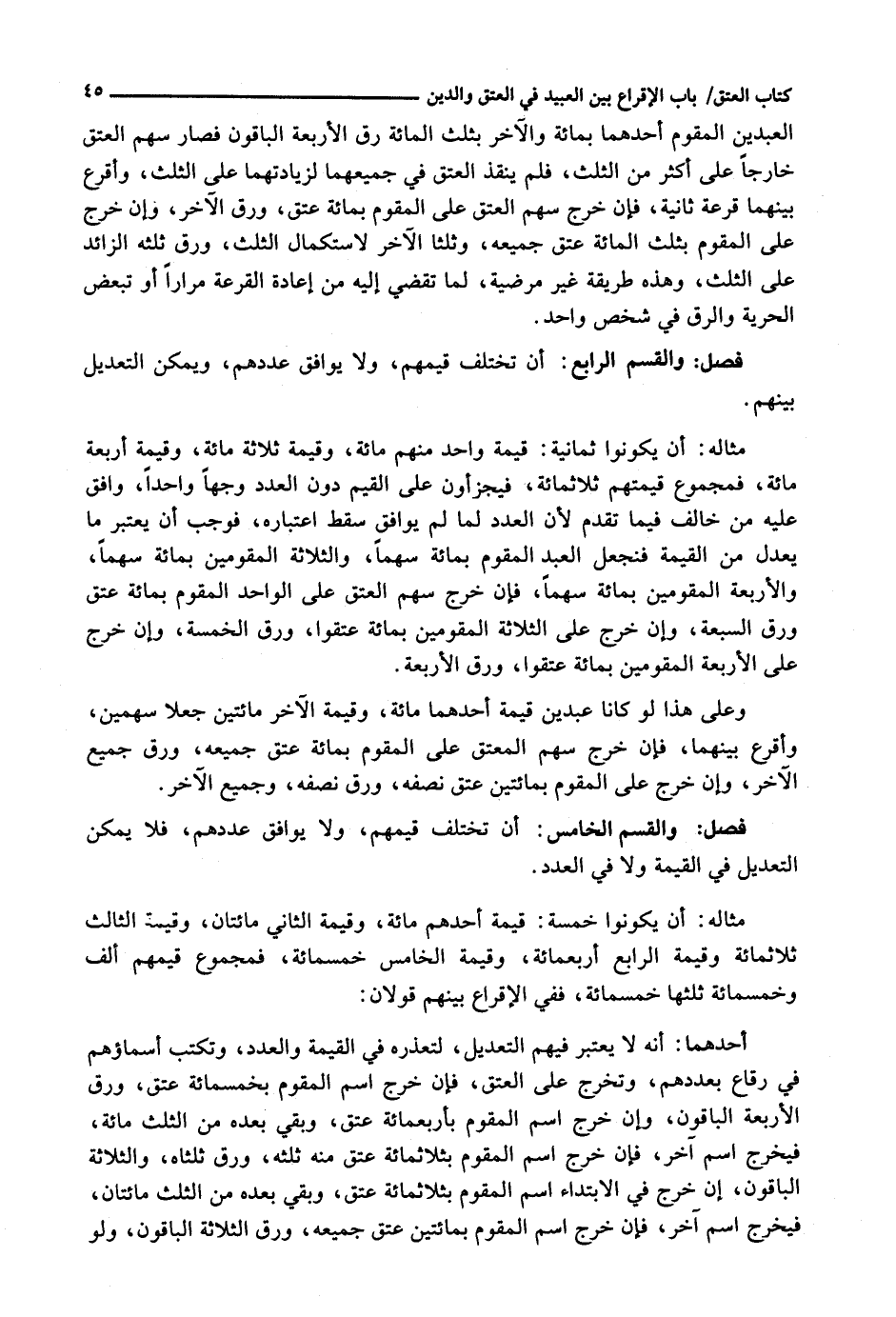 الْعَبْدَيْنِ الْمُقَوَّمِ أَحَدُهُمَا بِمِائَةٍ وَالْآخَرُ بِثُلُثِ الْمِائَةِ رَقَّ الْأَرْبَعَةُ الْبَاقُونَ فَصَارَ سَهْمُ الْعِتْقِ خَارِجًا على أكثر من الثلث، فلم ينقذ الْعِتْقُ فِي جَمِيعِهِمَا لِزِيَادَتِهِمَا عَلَى الثُّلُثِ، وَأَقْرَعَ بَيْنَهُمَا قُرْعَةً ثَانِيَةً، فَإِنْ خَرَجَ سَهْمُ الْعِتْقِ على المقوم بمائة عتق، ورق الآخر، وإن خَرَجَ عَلَى الْمُقَوَّمِ بِثُلُثِ الْمِائَةِ عَتَقَ جَمِيعُهُ، وَثُلُثَا الْآخَرِ لِاسْتِكْمَالِ الثُّلُثِ، وَرَقَّ ثُلُثُهُ الزَّائِدُ عَلَى الثُّلُثِ، وَهَذِهِ طَرِيقَةٌ غَيْرُ مَرْضِيَّةٍ، لِمَا تَقْضِي إِلَيْهِ مِنْ إِعَادَةِ الْقُرْعَةِ مِرَارًا أَوْ تَبَعُّضِ الْحُرِّيَّةِ وَالرِّقِّ فِي شَخْصٍ وَاحِدٍ.