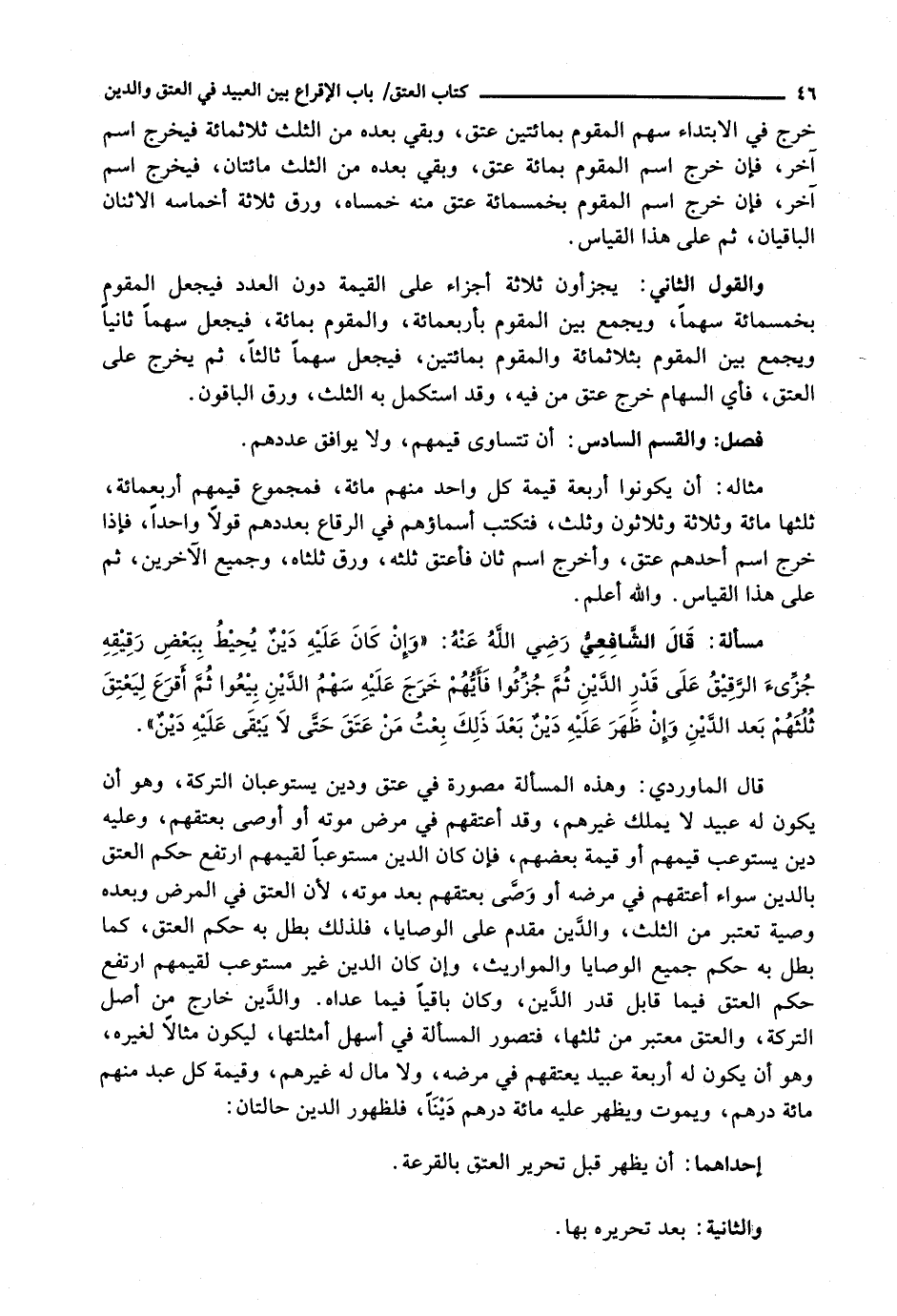 قَالَ الْمَاوَرْدِيُّ: وَهَذِهِ الْمَسْأَلَةُ مُصَوَّرَةٌ فِي عِتْقٍ وَدَيْنٍ يَسْتَوْعِبَانِ التَّرِكَةَ، وَهُوَ أَنْ يَكُونَ لَهُ عَبِيدٌ لَا يَمْلِكُ غَيْرَهُمْ، وَقَدْ أَعْتَقَهُمْ فِي مَرَضِ مَوْتِهِ أَوْ أَوْصَى بِعِتْقِهِمْ، وَعَلَيْهِ دَيْنٌ يَسْتَوْعِبُ قِيَمَهُمْ أَوْ قِيمَةَ بَعْضِهِمْ، فَإِنْ كَانَ الدَّيْنُ مُسْتَوْعِبًا لِقِيَمِهِمُ ارْتَفَعَ حُكْمُ الْعِتْقِ بِالدَّيْنِ سَوَاءٌ أَعْتَقَهُمْ فِي مَرَضِهِ أَوْ وَصَّى بِعِتْقِهِمْ بَعْدَ مَوْتِهِ، لِأَنَّ الْعِتْقَ فِي الْمَرَضِ وَبَعْدَهُ وَصِيَّةٌ تُعْتَبَرُ مِنَ الثُّلُثِ، وَالدَّيْنُ مُقَدَّمٌ عَلَى الْوَصَايَا، فَلِذَلِكَ بَطَلَ بِهِ حُكْمُ الْعِتْقِ، كَمَا بَطَلَ بِهِ حُكْمُ جَمِيعِ الْوَصَايَا وَالْمَوَارِيثِ، وَإِنْ كَانَ الدَّيْنُ غَيْرَ مُسْتَوْعِبٍ لِقِيَمِهِمُ ارْتَفَعَ حُكْمُ الْعِتْقِ فِيمَا قَابَلَ قَدْرَ الدَّيْنِ، وَكَانَ بَاقِيًا فِيمَا عَدَاهُ. وَالدَّيْنُ خَارِجٌ مِنْ أَصْلِ التَّرِكَةِ، وَالْعِتْقُ مُعْتَبَرٌ مِنْ ثُلُثِهَا، فَتَصَوُّرُ الْمَسْأَلَةِ فِي أَسْهَلِ أَمْثِلَتِهَا، لِيَكُونَ مِثَالًا لِغَيْرِهِ، وَهُوَ أَنْ يَكُونَ لَهُ أَرْبَعَةُ عَبِيدٍ يَعْتِقُهُمْ فِي مَرَضِهِ، وَلَا مَالَ لَهُ غَيْرُهُمْ، وَقِيمَةُ كُلِّ عَبْدٍ مِنْهُمْ مِائَةُ دِرْهَمٍ، وَيَمُوتُ وَيَظْهَرُ عَلَيْهِ مِائَةُ دِرْهَمٍ دَيْنًا، فَلِظُهُورِ الدَّيْنِ حَالَتَانِ: