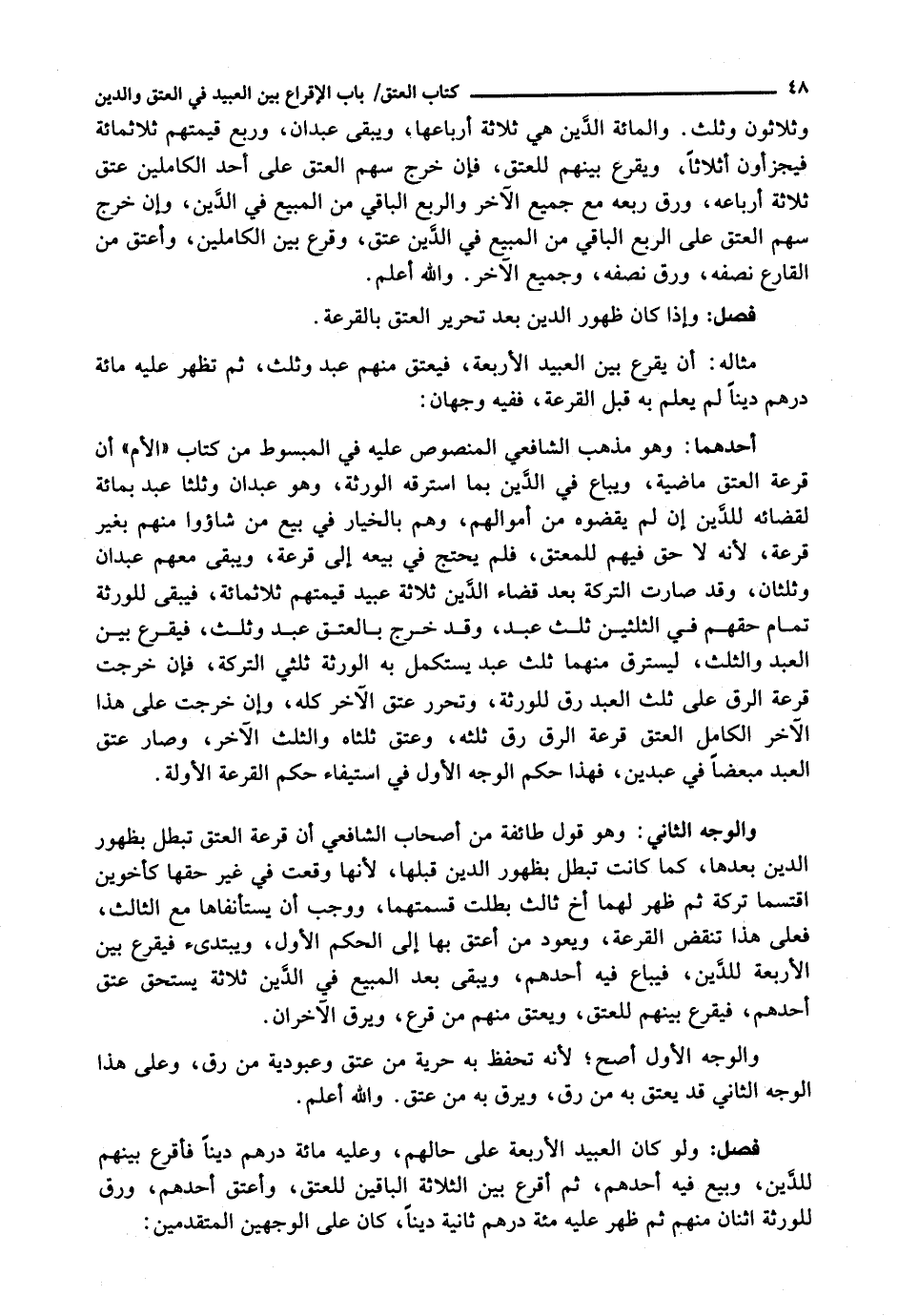أَحَدُهُمَا: وَهُوَ مَذْهَبُ الشَّافِعِيِّ الْمَنْصُوصُ عَلَيْهِ فِي الْمَبْسُوطِ مِنْ كِتَابِ (الْأُمِّ) أَنَّ قُرْعَةَ الْعِتْقِ مَاضِيَةٌ، وَيُبَاعُ فِي الدَّيْنِ بِمَا اسْتَرَقَّهُ الْوَرَثَةُ، وَهُوَ عَبْدَانِ وَثُلُثَا عَبْدٍ بِمِائَةٍ لِقَضَائِهِ لِلدَّيْنِ إِنْ لَمْ يَقْضُوهُ مِنْ أَمْوَالِهِمْ، وَهُمْ بِالْخِيَارِ فِي بَيْعِ مَنْ شاؤوا مِنْهُمْ بِغَيْرِ قُرْعَةٍ، لِأَنَّهُ لَا حَقَّ فِيهِمْ لِلْمُعْتِقِ، فَلَمْ يُحْتَجْ فِي بَيْعِهِ إِلَى قُرْعَةٍ، وَيَبْقَى مَعَهُمْ عَبْدَانِ وَثُلُثَانِ، وَقَدْ صَارَتِ التَّرِكَةُ بَعْدَ قَضَاءِ الدَّيْنِ ثَلَاثَةَ عَبِيدٍ قِيمَتُهُمْ ثَلَاثُمِائَةٍ، فَيَبْقَى لِلْوَرَثَةِ تَمَامُ حَقِّهِمْ فِي الثُّلُثَيْنِ ثُلُثُ عَبْدٍ، وَقَدْ خَرَجَ بِالْعِتْقِ عَبْدٌ وَثُلُثٌ، فَيُقْرَعُ بَيْنَ الْعَبْدِ وَالثُّلُثِ، لِيُسْتَرَقُّ مِنْهُمَا ثُلُثُ عَبْدٍ يَسْتَكْمِلُ بِهِ الْوَرَثَةُ ثُلُثَيِ التَّرِكَةِ، فَإِنْ خَرَجَتْ قُرْعَةُ الرِّقِّ عَلَى ثُلُثِ الْعَبْدِ رَقَّ لِلْوَرَثَةِ، وَتَحَرَّرَ عِتْقُ الْآخَرِ كُلِّهِ، وَإِنْ خَرَجَتْ عَلَى هَذَا الْآخَرِ الْكَامِلِ الْعِتْقِ قُرْعَةُ الرِّقِّ رَقَّ ثُلُثُهُ، وَعَتَقَ ثُلُثَاهُ وَالثُّلُثُ الْآخَرُ، وَصَارَ عِتْقُ الْعَبْدِ مُبَعَّضًا فِي عَبْدَيْنِ، فَهَذَا حُكْمُ الْوَجْهِ الأول في استيفاء حكم القرعة الأولة.