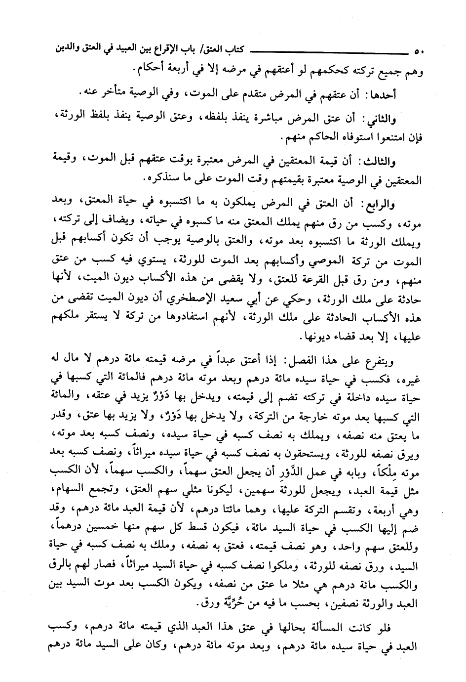 وَالرَّابِعُ: أَنَّ الْعِتْقَ فِي الْمَرَضِ يَمْلِكُونَ بِهِ مَا اكْتَسَبُوهُ فِي حَيَاةِ الْمُعْتِقِ، وَبَعْدَ مَوْتِهِ، وَكَسْبِ مَنْ رَقَّ مِنْهُمْ يَمْلِكُ الْمُعْتِقُ مِنْهُ مَا كَسَبُوهُ فِي حَيَاتِهِ، وَيُضَافُ إِلَى تَرِكَتِهِ، وَيَمْلِكُ الْوَرَثَةُ مَا اكْتَسَبُوهُ بَعْدَ مَوْتِهِ، وَالْعِتْقُ بِالْوَصِيَّةِ يُوجِبُ أَنْ تَكُونَ أَكْسَابُهُمْ قَبْلَ الْمَوْتِ مِنْ تَرِكَةِ الْمُوصِي وَأَكْسَابُهُمْ بَعْدَ الْمَوْتِ لِلْوَرَثَةِ، يَسْتَوِي فِيهِ كَسْبُ مَنْ عَتَقَ مِنْهُمْ، وَمَنْ رَقَّ قَبْلَ الْقُرْعَةِ لِلْعِتْقِ، وَلَا يُقْضَى مِنْ هَذِهِ الْأَكْسَابِ دُيُونُ الْمَيِّتِ، لِأَنَّهَا حَادِثَةٌ عَلَى مِلْكِ الْوَرَثَةِ، وَحُكِيَ عَنْ أَبِي سَعِيدٍ الْإِصْطَخْرِيِّ أَنَّ دُيُونَ الْمَيِّتِ تُقْضَى مِنْ هَذِهِ الْأَكْسَابِ الْحَادِثَةِ عَلَى مِلْكِ الْوَرَثَةِ، لِأَنَّهُمُ اسْتَفَادُوهَا مِنْ تَرِكَةٍ لَا يَسْتَقِرُّ مِلْكُهُمْ عَلَيْهَا، إِلَّا بَعْدَ قَضَاءِ دُيُونِهَا.