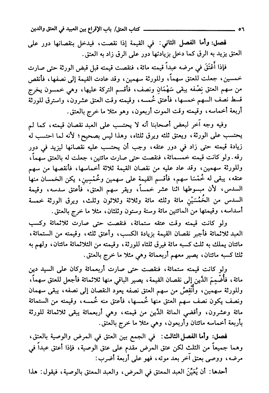 وَفِيهِ وَجْهٌ آخَرُ لِبَعْضِ أَصْحَابِنَا أَنَّهُ لَا يُحْتَسَبُ عَلَى الْعَبْدِ نُقْصَانُ قِيمَتِهِ، كَمَا لَمْ يُحْتَسَبْ عَلَى الْوَرَثَةِ، وَيُعْتَقُ ثُلُثُهُ وَيَرِقُّ ثُلُثَاهُ، وَهَذَا لَيْسَ بِصَحِيحٍ؛ لِأَنَّهُ لَمَّا احْتُسِبَ لَهُ زِيَادَةُ قِيمَتِهِ حَتَّى زَادَ فِي دَوْرِ عِتْقِهِ، وَجَبَ أَنْ يُحْتَسَبَ عَلَيْهِ نُقْصَانُهَا لِيَزِيدَ فِي دَوْرِ رِقِّهِ. وَلَوْ كَانَتْ قِيمَتُهُ خَمْسَمِائَةٍ، فَنَقَصَتْ حَتَّى صَارَتْ مِائَتَيْنِ، جَعَلْتُ لَهُ بِالْعِتْقِ سَهْمًا، وَلِلْوَرَثَةِ سَهْمَيْنِ، وَقَدْ عَادَ عليه من نقصان القيمة ثلاثة أخماسها، فأنقضها مِنْ سَهْمِ عِتْقِهِ، يَبْقَى لَهُ خُمْسَا سَهْمٍ، فَأَقْسِمُ الْقِيمَةَ عَلَى سَهْمَيْنِ وَخُمْسَيْنِ، يَكُنِ الْخُمْسَانِ مِنْهَا السُّدْسُ، لِأَنَّ مَبْسُوطَهَا اثْنَا عَشَرَ خُمْسًا، وَيُقَرُّ سَهْمُ الْعِتْقِ، فَأَعْتِقُ سُدْسَهُ، وَقِيمَةُ السُّدْسِ مِنَ الْخُمْسَيْنِ مِائَةٌ وَثُلُثُهُ مِائَةٌ وَثَلَاثَةٌ وَثَلَاثُونَ وَثُلُثٌ، وَيَرِقُّ الْوَرَثَةُ خَمْسَةُ أَسْدَاسِهِ، وَقِيمَتُهَا مِنَ الْمِائَتَيْنِ مِائَةٌ وَسِتَّةٌ وَسِتُّونَ وَثُلُثَانِ، مِثْلَا مَا خَرَجَ بِالْعِتْقِ.