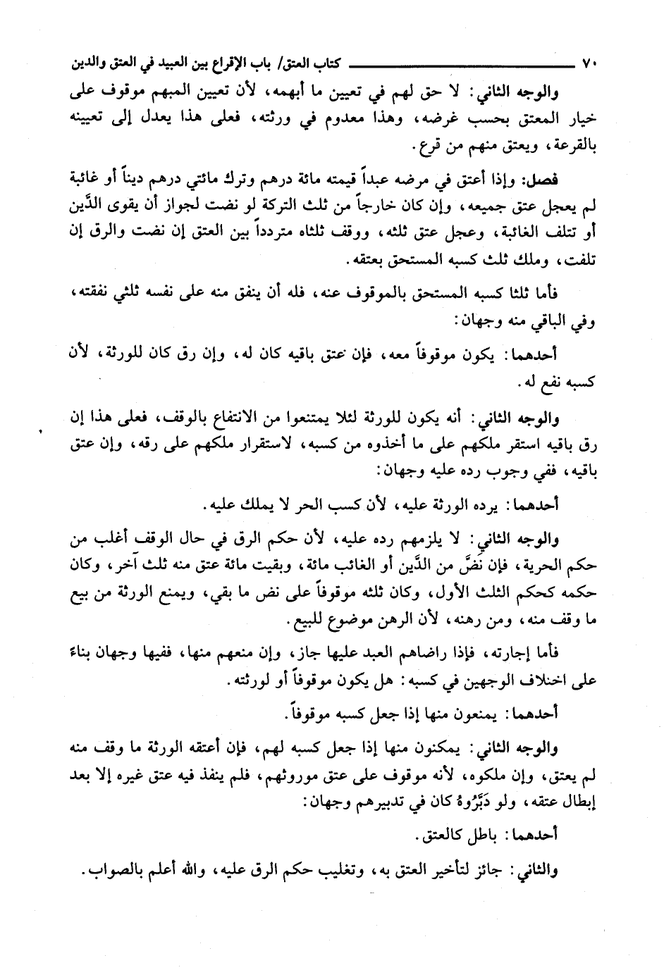 : وَإِذَا أَعْتَقَ فِي مَرَضِهِ عَبْدًا قِيمَتُهُ مِائَةُ دِرْهَمٍ وَتَرَكَ مِائَتَيْ دِرْهَمٍ دَيْنًا أَوْ غَائِبَةً لَمْ يُعَجَّلْ عتق جميعه، وإن كان خارجاً من ثلث التركة لو نضت لجواز أن يقوى الدين أو تتلف الغائبة، وعجل عتق ثلثه، ووقف ثلثا مُتَرَدِّدًا بَيْنَ الْعِتْقِ إِنْ نَضَّتْ وَالرِّقِّ إِنْ تَلِفَتْ، وَمَلَكَ ثُلُثَ كَسْبِهِ الْمُسْتَحَقِّ بِعِتْقِهِ.