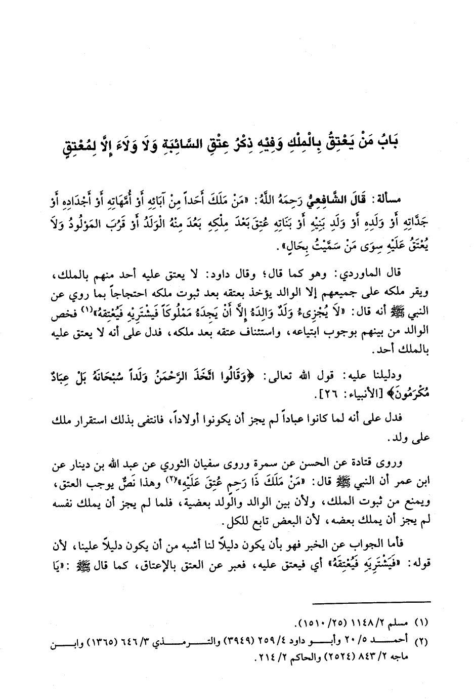 : قَالَ الشَّافِعِيُّ رَحِمَهُ اللَّهُ: (مَنْ مَلَكَ أَحَدًا مِنْ آَبَائِهِ أَوْ أُمَّهَاتِهِ أَوْ أَجْدَادِهِ أَوْ جداته أو ولده بَنِيْهِ أَوْ بَنَاتِهِ عَتَقَ بَعْدَ مِلْكِهِ بَعُدَ مِنْهُ الْوَلَدُ أَوْ قَرُبَ الْمَوْلُودُ وَلَا يُعْتَقُ عَلَيْهِ سِوَى مَنْ سَمَّيْتُ بِحَالٍ) .