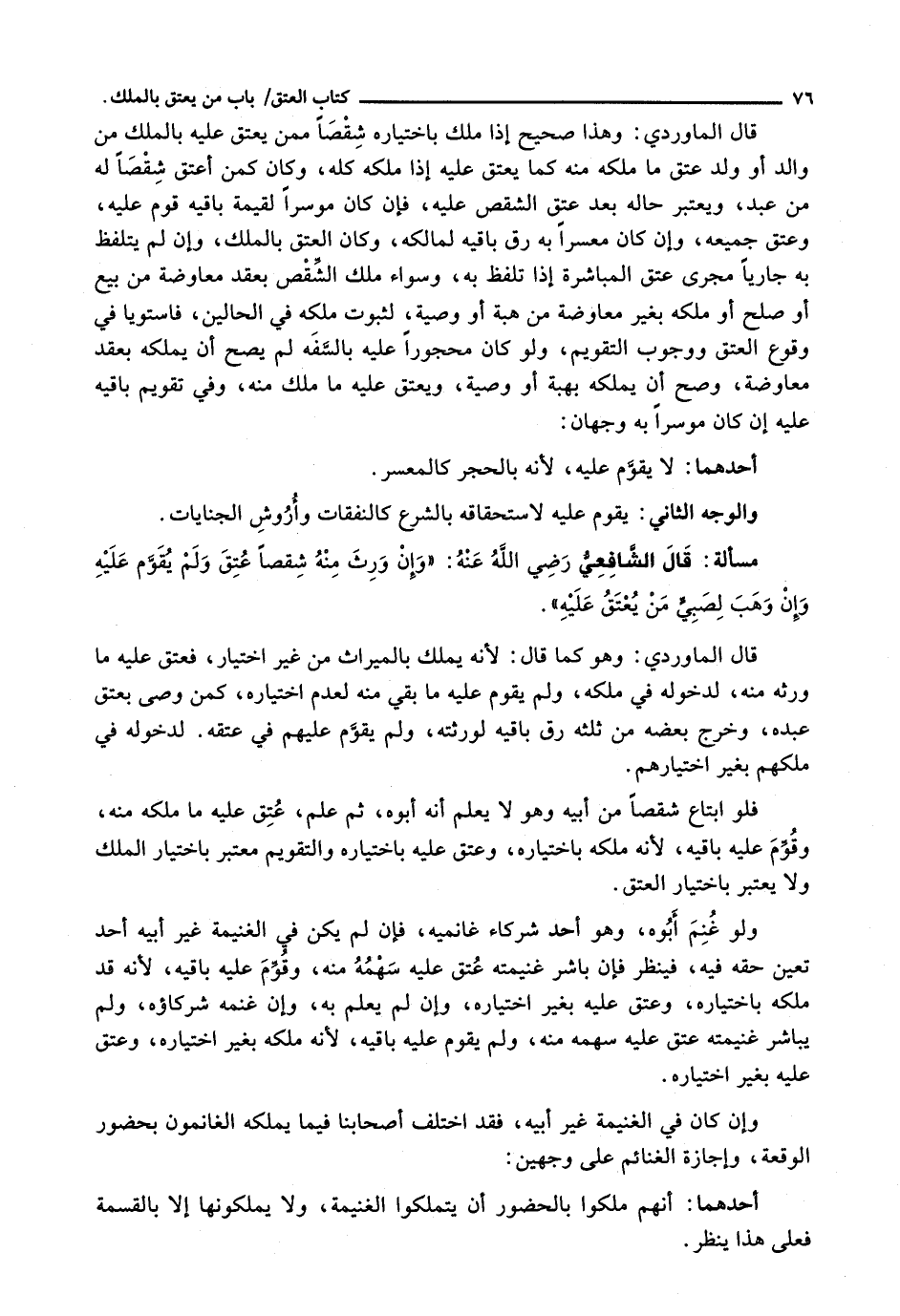 قَالَ الْمَاوَرْدِيُّ: وَهَذَا صَحِيحٌ إِذَا مَلَكَ بِاخْتِيَارِهِ شِقْصًا مِمَّنْ يُعْتِقُ عَلَيْهِ بِالْمِلْكِ مِنْ وَالِدٍ أَوْ وَلَدٍ عَتَقَ مَا مَلَكَهُ مِنْهُ كَمَا يُعْتَقُ عَلَيْهِ إِذَا مَلَكَهُ كُلَّهُ، وَكَانَ كَمَنْ أَعْتَقَ شِقْصًا لَهُ مِنْ عَبْدٍ، وَيُعْتَبَرُ حَالُهُ بَعْدَ عِتْقِ الشِّقْصِ عَلَيْهِ، فَإِنْ كَانَ مُوسِرًا لِقِيمَةِ بَاقِيهِ قُوِّمَ عَلَيْهِ، وَعَتَقَ جَمِيعُهُ، وَإِنْ كَانَ مُعْسِرًا بِهِ رَقَّ بَاقِيهِ لِمَالِكِهِ، وَكَانَ الْعِتْقُ بِالْمِلْكِ، وَإِنْ لَمْ يَتَلَفَّظْ بِهِ جَارِيًا مَجْرَى عِتْقِ الْمُبَاشَرَةِ إِذَا تَلَفَّظَ بِهِ، وَسَوَاءٌ مَلَكَ الشِّقْصَ بِعَقْدِ مُعَاوَضَةٍ مِنْ بَيْعٍ أَوْ صُلْحٍ أَوْ مَلَكَهُ بِغَيْرِ مُعَاوَضَةٍ مِنْ هِبَةٍ أَوْ وَصِيَّةٍ، لِثُبُوتِ مِلْكِهِ فِي الْحَالَيْنِ، فَاسْتَوَيَا فِي وُقُوعِ الْعِتْقِ وَوُجُوبِ التَّقْوِيمِ، وَلَوْ كَانَ مَحْجُورًا عَلَيْهِ بِالسَّفَهِ لَمْ يَصِحَّ أَنْ يَمْلِكَهُ بِعَقْدِ مُعَاوَضَةٍ، وَصَحَّ أَنْ يَمْلِكَهُ بِهِبَةٍ أَوْ وَصِيَّةٍ، وَيُعْتَقُ عَلَيْهِ مَا مَلَكَ مِنْهُ، وَفِي تَقْوِيمِ بَاقِيهِ عَلَيْهِ إِنْ كَانَ مُوسِرًا بِهِ وَجْهَانِ: