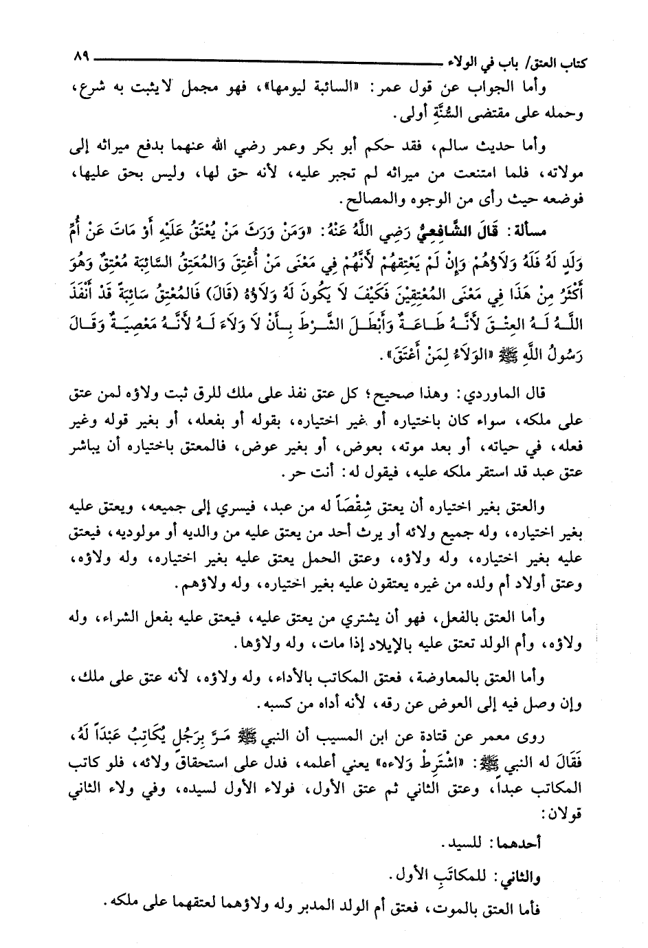 قَالَ الْمَاوَرْدِيُّ: وَهَذَا صَحِيحٌ؛ كُلُّ عِتْقٍ نَفَذَ عَلَى مِلْكٍ لِلرِّقِّ ثَبَتَ وَلَاؤُهُ لِمَنْ عَتَقَ عَلَى مِلْكِهِ، سَوَاءٌ كَانَ بِاخْتِيَارِهِ أَوْ غَيْرِ اخْتِيَارِهِ، بِقَوْلِهِ أَوْ بِفِعْلِهِ، أَوْ بِغَيْرِ قَوْلِهِ وَغَيْرِ فِعْلِهِ، فِي حَيَاتِهِ، أَوْ بَعْدَ مَوْتِهِ، بِعِوَضٍ، أَوْ بِغَيْرِ عِوَضٍ، فَالْمُعْتِقُ بِاخْتِيَارِهِ أَنْ يُبَاشِرَ عِتْقَ عَبْدٍ قَدِ اسْتَقَرَّ مِلْكُهُ عَلَيْهِ، فَيَقُولُ لَهُ: أَنْتَ حُرٌّ.