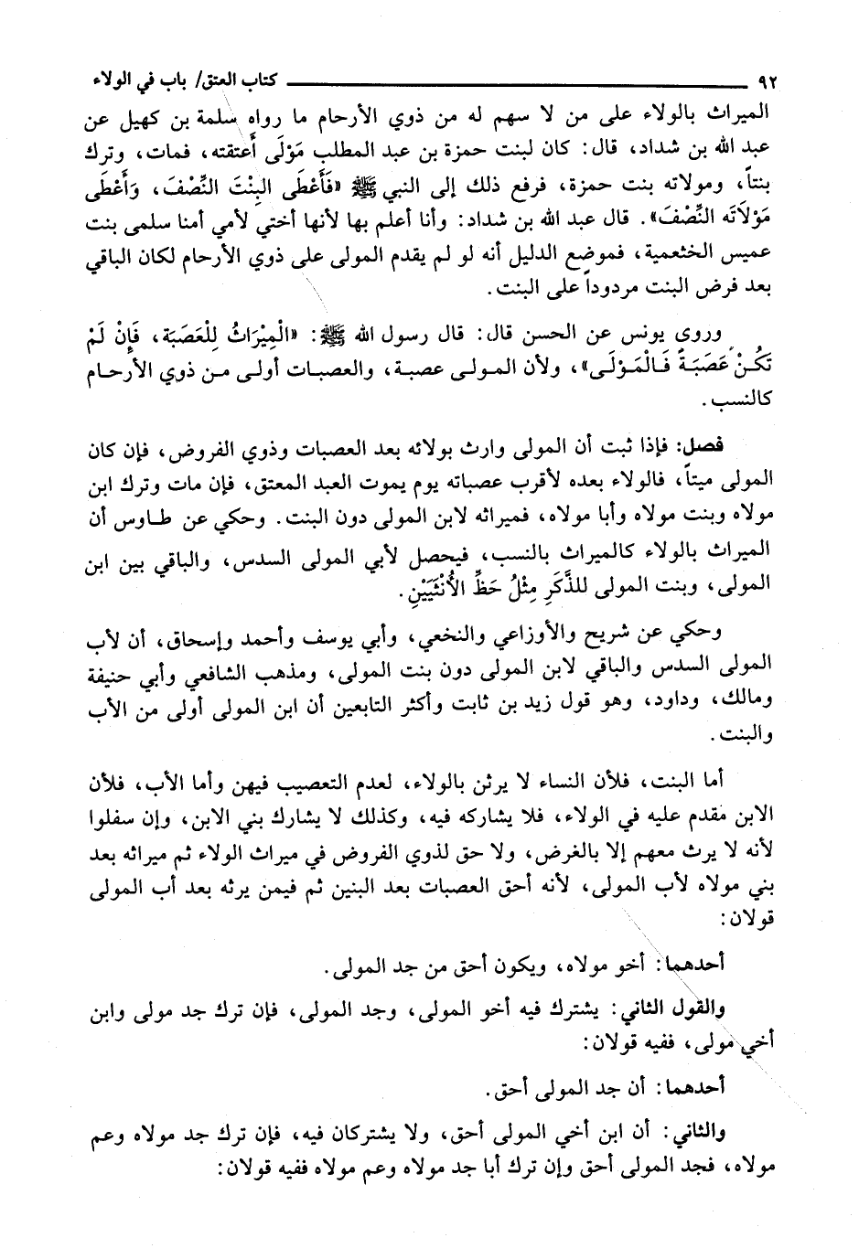 الْمِيرَاثِ بِالْوَلَاءِ عَلَى مَنْ لَا سَهْمَ لَهُ مِنْ ذَوِي الْأَرْحَامِ مَا رَوَاهُ سَلَمَةُ بْنُ كُهَيْلٍ عَنْ عَبْدِ اللَّهِ بْنِ شَدَّادٍ، قَالَ كَانَ لِبِنْتِ حَمْزَةَ بْنِ عَبْدِ الْمُطَّلِبِ مَوْلًى أَعْتَقَتْهُ، فَمَاتَ، وَتَرَكَ بِنْتًا، وَمَوْلَاتُهُ بِنْتُ حَمْزَةَ، فَرُفِعَ ذَلِكَ إِلَى النَّبِيِّ - صَلَّى اللَّهُ عَلَيْهِ وَسَلَّم َ - (فَأَعْطَى الْبِنْتَ النِّصْفَ، وَأَعْطَى مَوْلَاتَهُ النِّصْفَ) . قَالَ عَبْدُ اللَّهِ بْنُ شَدَّادٍ: وَأَنَا أَعْلَمُ بِهَا لِأَنَّهَا أُخْتِي لِأُمِّي أُمُّنَا سَلْمَى بِنْتُ عُمَيْسٍ الْخَثْعَمِيَّةُ، فَمَوْضِعُ الدَّلِيلِ أَنَّهُ لَوْ لَمْ يُقَدِّمِ الْمَوْلَى عَلَى ذَوِي الْأَرْحَامِ لَكَانَ الْبَاقِي بَعْدَ فَرْضِ الْبِنْتِ مَرْدُودًا عَلَى الْبِنْتِ.