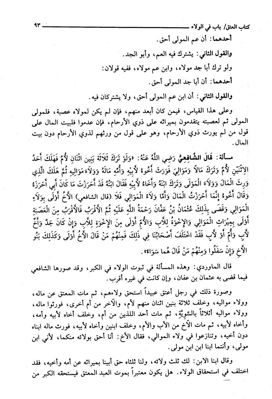 قَالَ الْمَاوَرْدِيُّ: وَهَذِهِ الْمَسْأَلَةُ فِي ثُبُوتِ الْوَلَاءِ فِي الْكِبَرِ، وَقَدْ صَوَّرَهَا الشَّافِعِيُّ فِيمَا قَضَى بِهِ عُثْمَانُ بْنُ عَفَّانَ، وَإِنْ كَانَتْ فِي غَيْرِهِ أَقْرَبَ.