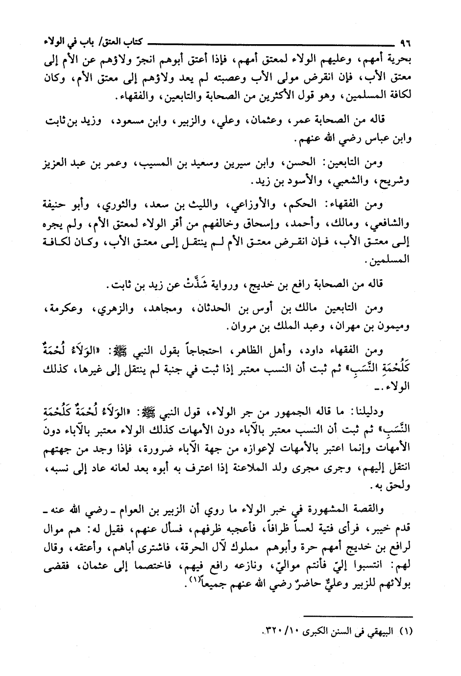 وَالْقِصَّةُ الْمَشْهُورَةُ فِي خَبَرِ الْوَلَاءِ مَا رُوِيَ أَنَّ الزُّبَيْرَ بْنَ الْعَوَّامِ - رَضِيَ اللَّهُ عَنْهُ - قَدِمَ خَيْبَرَ، فَرَأَى فِتْيَةً لُعْسًا ظِرَافًا، فَأَعْجَبَهُ ظُرْفُهُمْ، فَسَأَلَ عَنْهُمْ، فَقِيلَ لَهُ: هُمْ مَوَالٍ لِرَافِعِ بْنِ خَدِيجٍ أُمُّهُمْ حُرَّةٌ وَأَبُوهُمْ مَمْلُوكٌ لِآلِ الْحُرْقَةِ، فَاشْتَرَى أَبَاهُمْ، وَأَعْتَقَهُ، وَقَالَ لَهُمْ: انْتَسِبُوا إِلَيَّ فَأَنْتُمْ مَوَالِيَّ، وَنَازَعَهُ رَافِعٌ فِيهِمْ، فَاخْتَصَمَا إِلَى عُثْمَانَ، فَقَضَى بِوَلَائِهِمْ لِلزُّبَيْرِ وَعَلَيٌّ حَاضِرٌ رَضِيَ اللَّهُ عَنْهُمْ جَمِيعًا.