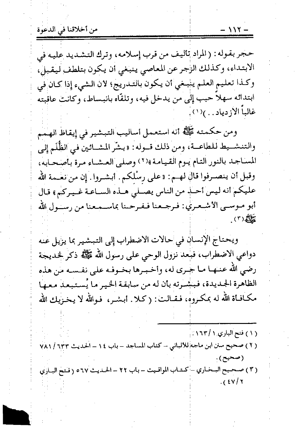 ومن حكمته - صلى الله عليه وسلم - أنه استعمل أساليب التبشير في إيقاظ الهمم والتنشيط للطاعة، ومن ذلك قوله: «بشِّر المشائين في الظُّلَم إلى المساجد بالنور التامِّ يوم القيامة» (¬2)، وصلى العشاء مرة بأصحابه، وقبل أن ينصرفوا قال لهم: «على رسلكم، أبشروا، إن من نعمة الله عليكم أنه ليس أحد من الناس يصلي هذه الساعة غيركم»، قال أبو موسى الأشعري: فرجعنا ففرحنا بما سمعنا من رسول الله - صلى الله عليه وسلم - (¬3).