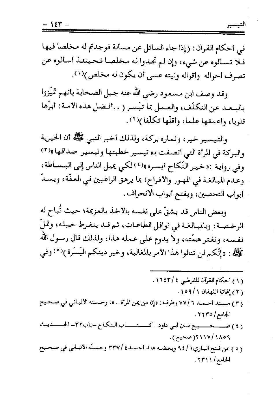 والتيسير خير، وثمارُه بركة، ولذلك أخبر النبي - صلى الله عليه وسلم - أن الخيرية والبركة في المرأة التي اتصفت بـ تيسير خطبتها وتيسير صداقها» (¬3)، وفي رواية: «خير النكاح أيسره» (¬4)، لكي يميل الناس إلى البساطة، وعدم المبالغة في المهور والأفراح؛ بما يُرهِق الراغبين في العفَّة، ويسد أبواب التحصين، ويفتح أبواب الانحراف.