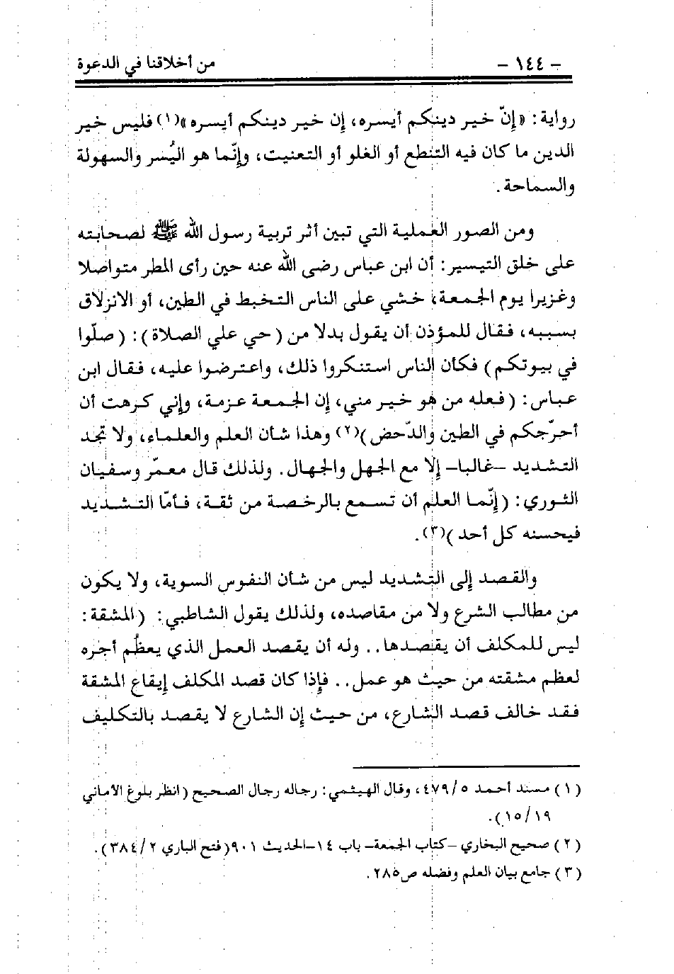 رواية: «إن خير دينكم أيسره، إن خير دينكم أيسره» (¬1)، فليس خير الدين ما كان فيه التنطع أو الغلو أو التعنيت، وإنما هو اليسر والسهولة والسماحة.