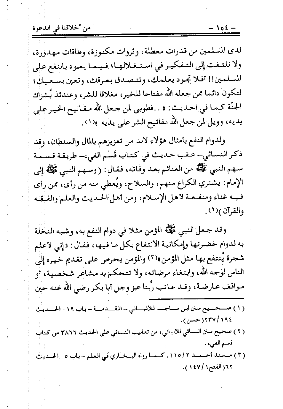 ولدوام النفع بأمثال هؤلاء لا بدَّ من تعزيزهم بالمال والسلطان، وقد ذكر النسائي - عقب حديث في كتاب قسم الفيء - طريقة قسمة سهم النبي - صلى الله عليه وسلم - من الغنائم بعد وفاته، فقال: (وسهم النبي - صلى الله عليه وسلم - إلى الإمام: يشتري الكراع منهم، والسلاح، ويُعطي منه مَن رأى، ممن رأى فيه غناءً ومنفعة لأهل الإسلام، ومن أهل الحديث والعلم والفقه والقرآن) (¬2).