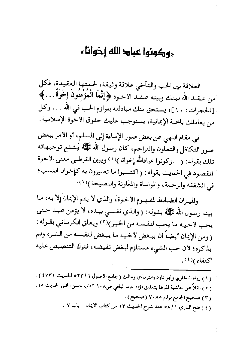 في مقام النهي عن بعض صور الإساءة إلى المسلم، أو الأمر ببعض صور التكافل والتعاون والتراحم، كان رسول الله - صلى الله عليه وسلم - يشفع توجيهاته تلك بقوله: «.. وكونوا عباد الله إخوانًا» (¬1)، ويُبيِّن القرطبي معنى الأخوة المقصود في الحديث بقوله: (اكتسبوا ما تصيرون به كإخوان النسب؛ في الشفقة والرحمة، والمواساة والمعاونة والنصيحة) (¬2).