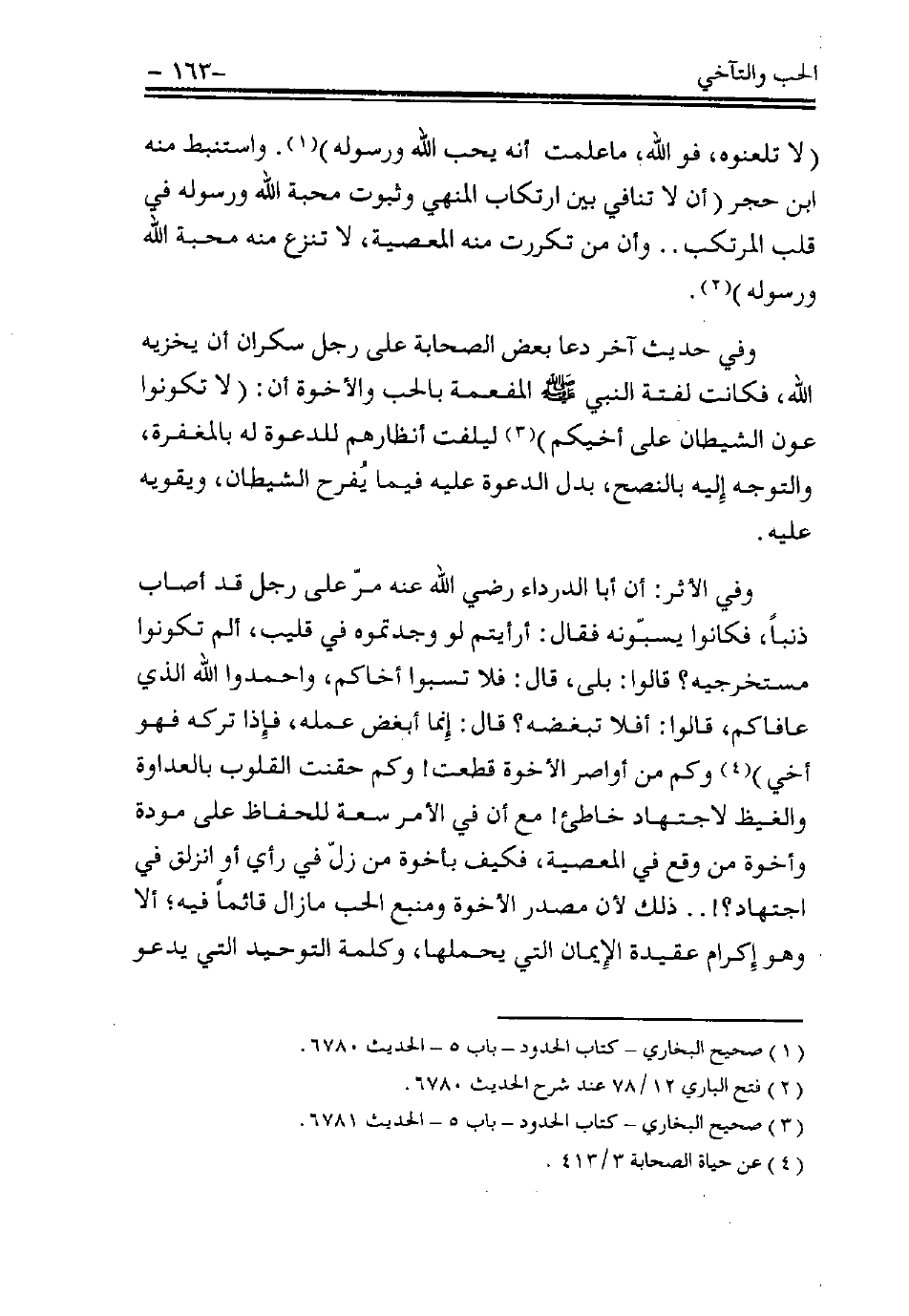 «لا تلعنوه، فوالله، ما علمت أنه يحب الله ورسوله» (¬1)، واستنبط منه ابن حجر (أن لا تنافي بين ارتكاب المنهي وثبوت محبة الله ورسوله في قلب المرتكب، وأن من تكررت منه المعصية، لا تنزع منه محبة الله ورسوله) (¬2).