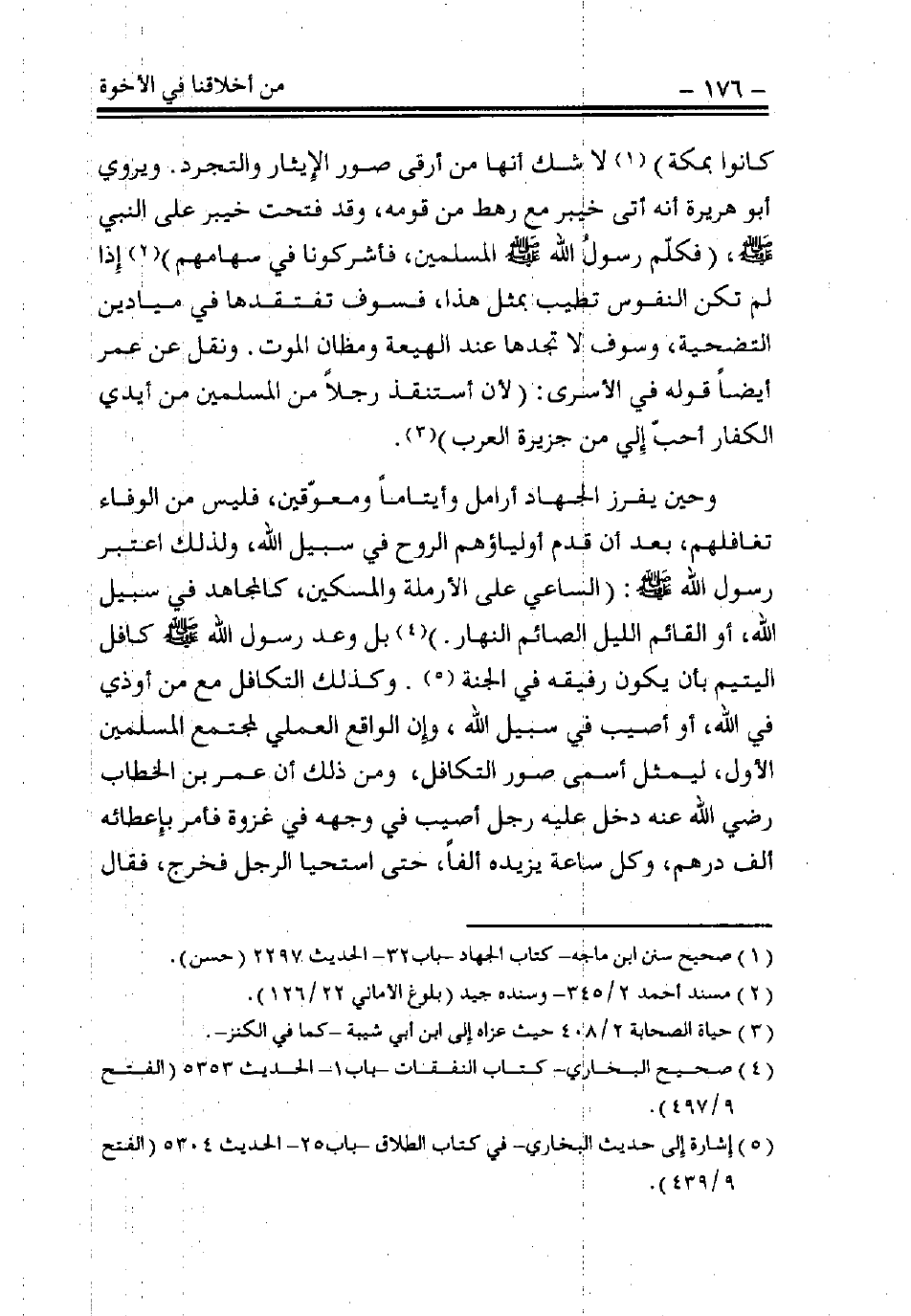 وحين يفرز الجهاد أرامل وأيتامًا ومُعوَّقين، فليس من الوفاء تغافلهم، بعد أن قدم أولياؤهم الروح في سبيل الله، ولذلك اعتبر رسول الله - صلى الله عليه وسلم -: «الساعي على الأرملة والمسكين، كالمجاهد في سبيل الله، أو القائم الليل الصائم النهار» (¬4)، بل وعد رسول الله - صلى الله عليه وسلم - كافل اليتيم بأن يكون رفيقه في الجنة (¬5)، وكذلك التكافل مع مَن أوذي في الله، أو أصيب في سبيل الله، وإن الواقع العملي لمجتمع المسلمين الأول، ليمثل أسمى صور التكافل، ومن ذلك أن عمر بن الخطاب - رضي الله عنه - دخل عليه رجل أصيب في وجهه في غزوة فأمر بإعطائه ألف درهم، وكل ساعة يزيده ألفًا، حتى استحيا الرجل فخرج، فقال