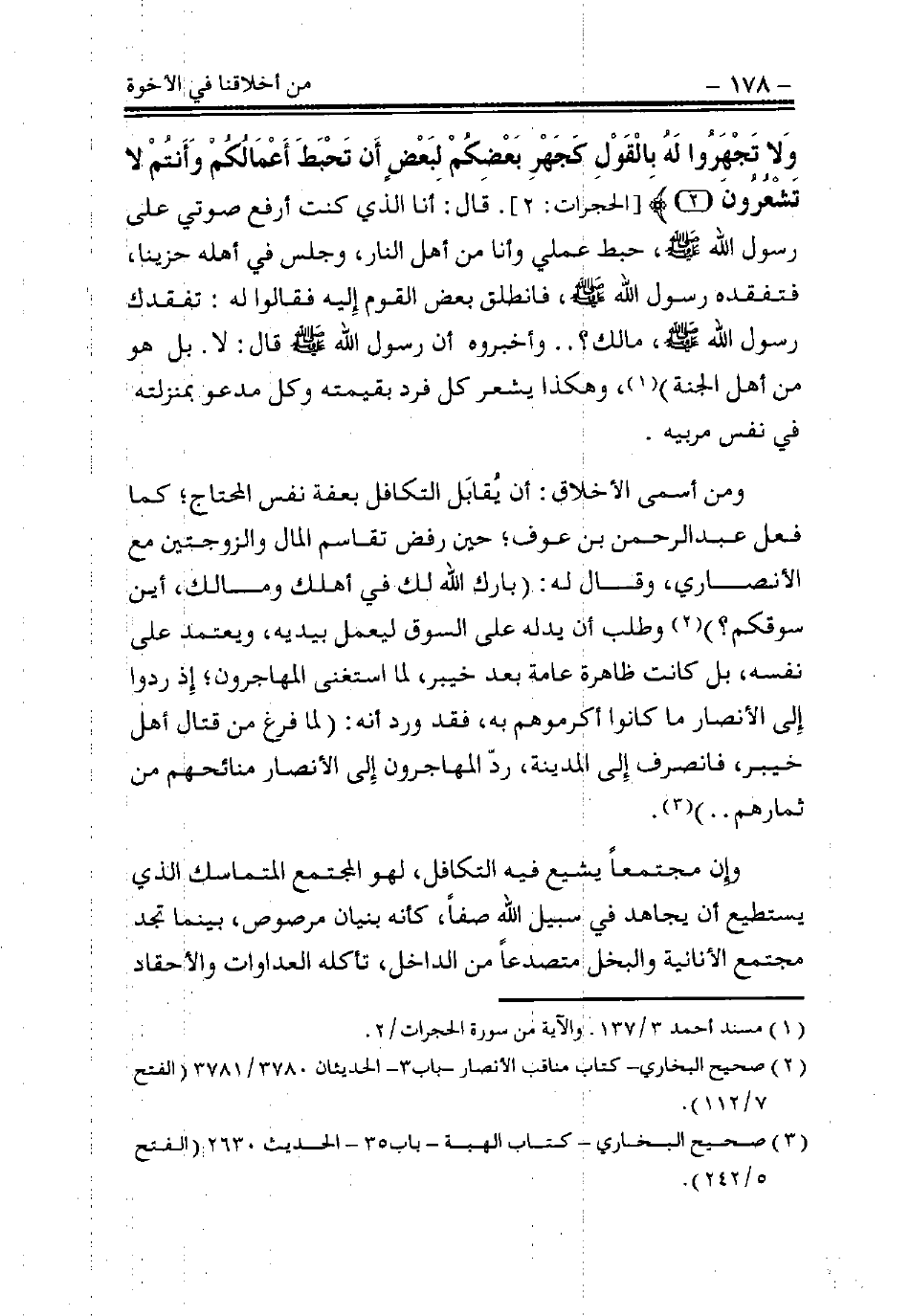 ومن أسمى الأخلاق: أن يُقابَل التكافل بعفَّة نفس المحتاج؛ كما فعل عبدالرحمن بن عوف؛ حين رفض تقاسم المال والزوجتين مع الأنصاري، وقال له: (بارك الله لك في أهلك ومالك، أين سوقكم؟) (¬2)، وطلب أن يدُلَّه على السوق ليعمل بيديه، ويعتمد على نفسه، بل كانت ظاهرة عامَّة بعد خيبر، لما استغنى المهاجرون؛ إذ ردُّوا إلى الأنصار ما كانوا أكرموهم به، فقد ورد أنه: (لما فرغ من قتال أهل خيبر، فانصرف إلى المدينة، ردَّ المهاجرون إلى الأنصار منائحهم من ثمارهم ..) (¬3).