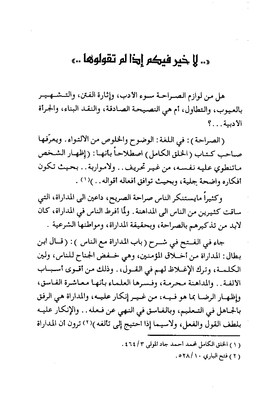 وكثيرًا ما يستنكر الناس صراحةَ الصريح، داعين إلى المداراة، التي ساقت كثيرين من الناس إلى المداهنة، ولَمَّا أفرط الناس في المداراة، كان لا بدَّ من تذكيرهم بالصراحة، وبحقيقة المداراة، ومواطنها الشرعية.