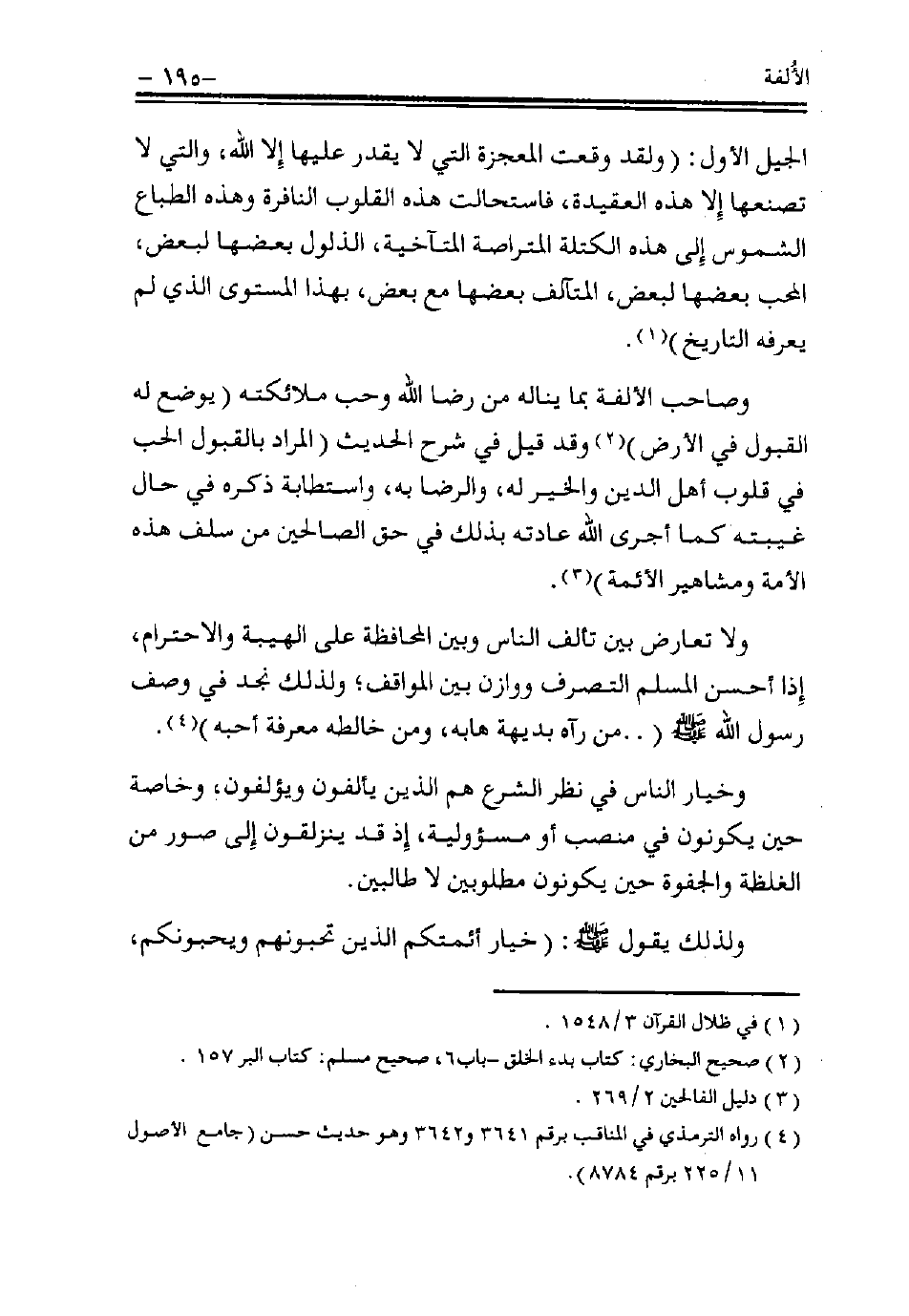 الجيل الأول: (ولقد وقعت المعجزة التي لا يقدر عليها إلا الله، والتي لا تصنعها إلا هذه العقيدة، فاستحالت هذه القلوب النافرة وهذه الطباع الشموس إلى هذه الكتلة المتراصة المتآخية، الذَّلول بعضها لبعض، المحب بعضها لبعض، المتآلف بعضها مع بعض، بهذا المستوى الذي لم يعرفه التاريخ) (¬1).