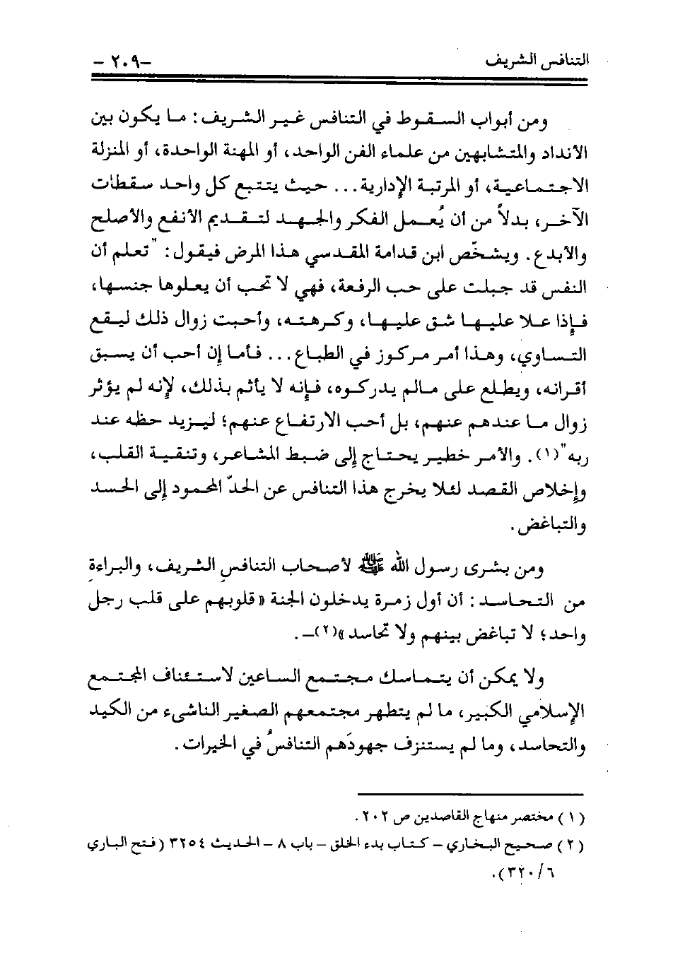 ويشخِّص ابن قدامة المقدسي هذا المرض، فيقول: (تعلم أن النفس قد جُبِلت على حبِّ الرفعة، فهي لا تحب أن يعلوها جنسها، فإذا علا عليه شق عليها، وكرِهَته، وأحبَّت زوال ذلك ليقع التساوي، وهذا أمر مركوز في الطباع، فأما إن أحب أن يسبق أقرانه، ويطلع على ما لم يُدرِكوه، فإنه لا يأثم بذلك، لإنه لم يؤثر زوال ما عندهم عنهم، بل أحب الارتفاع عنهم؛ ليزيد حظه عند ربه) (¬1).